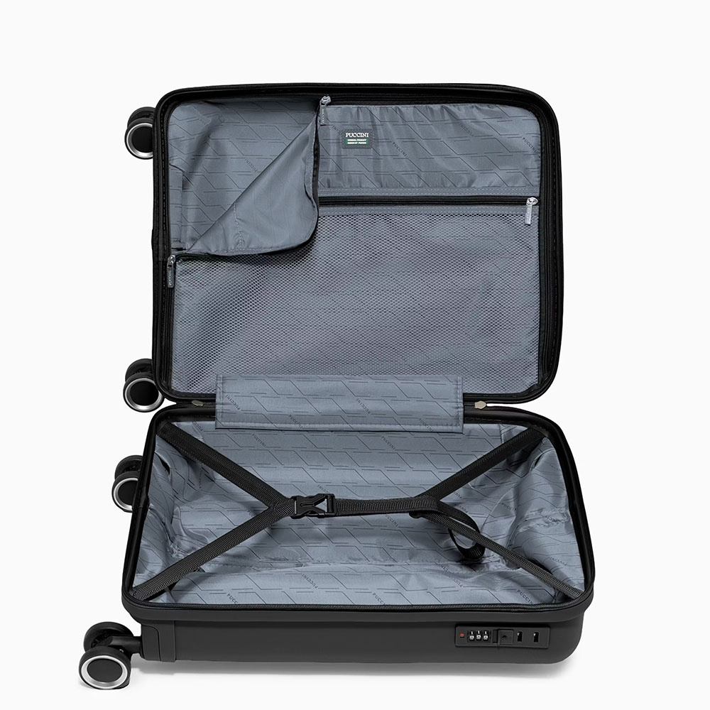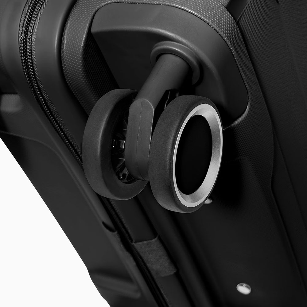 - walizka twarda wykonana z polipropylenu, materiału charakteryzującego się super lekką wagą i niezwykłą wytrzymałością