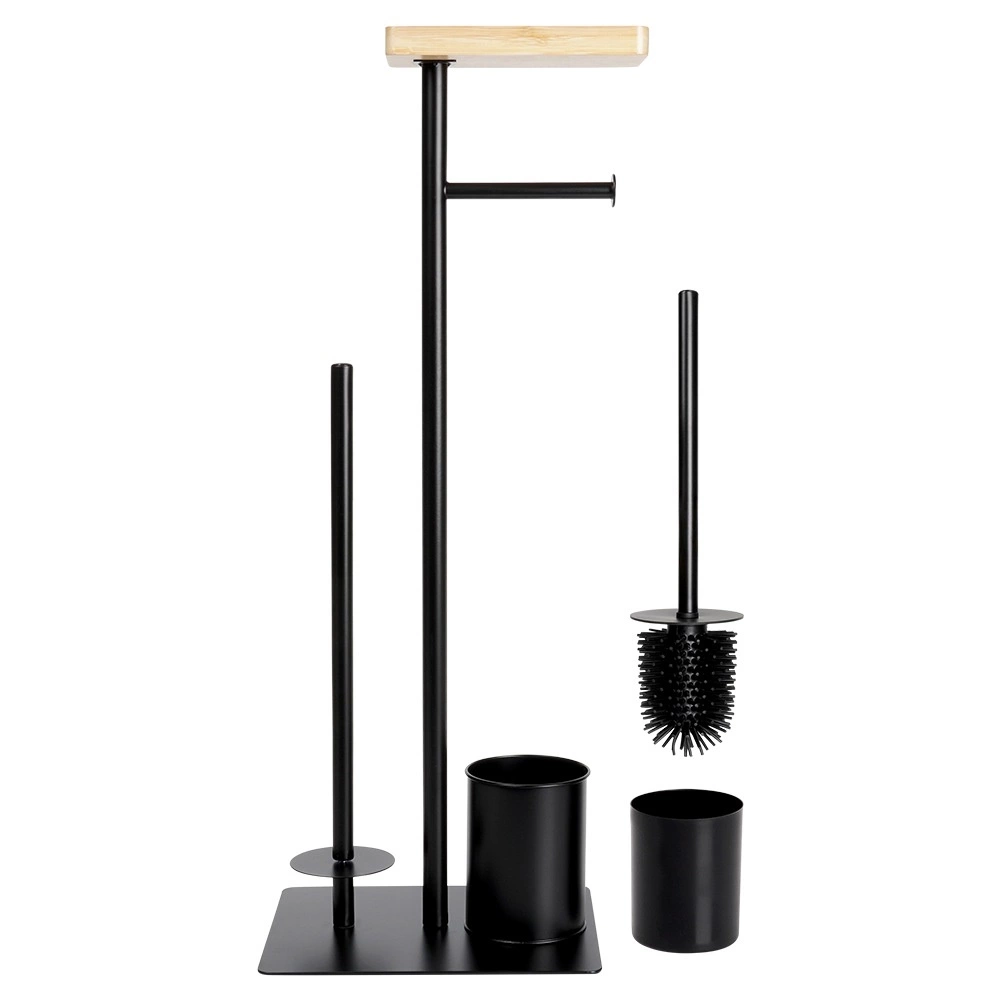 - Stojak na papier toaletowy oraz szczotką WC. Wykonany z metalu w czarnym kolorze. Szczotka ma silikonowe włosie w czarnym kolorze. Posiada półeczkę na telefon.