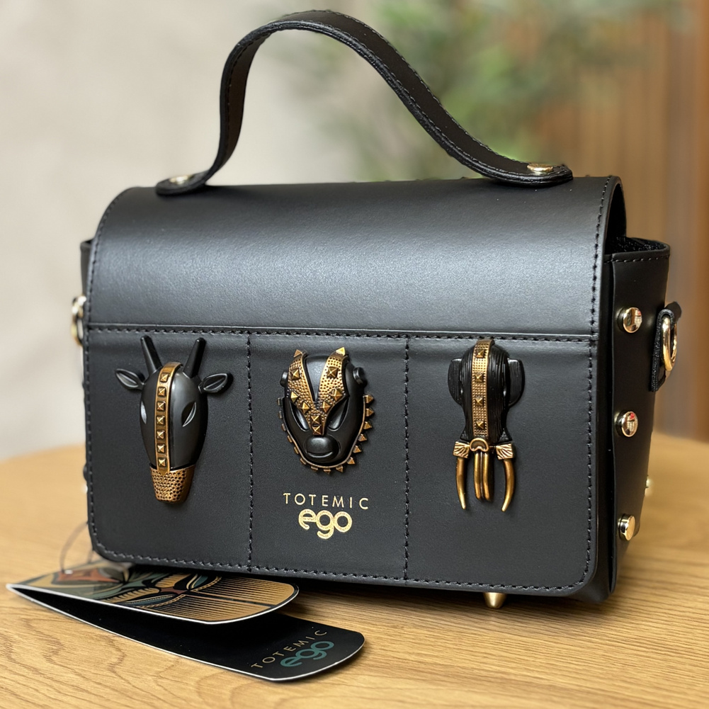 - Klapa ozdobiona czarno-złotymi nitami w kształcie etnicznych masek w stylu azteckim