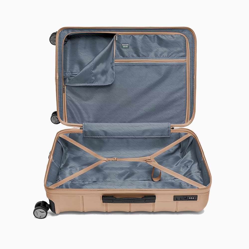 Cairo Collection dostępna jest w trzech rozmiarach – dużym, średnim i kabinowym – dzięki czemu można dopasować walizkę do każdej podróży. Bogata paleta kolorów obejmuje zarówno klasyczne odcienie, jak i efektowne barwy rose gold oraz złotą, które przyciągają wzrok i pozwalają wyróżnić się na lotnisku.