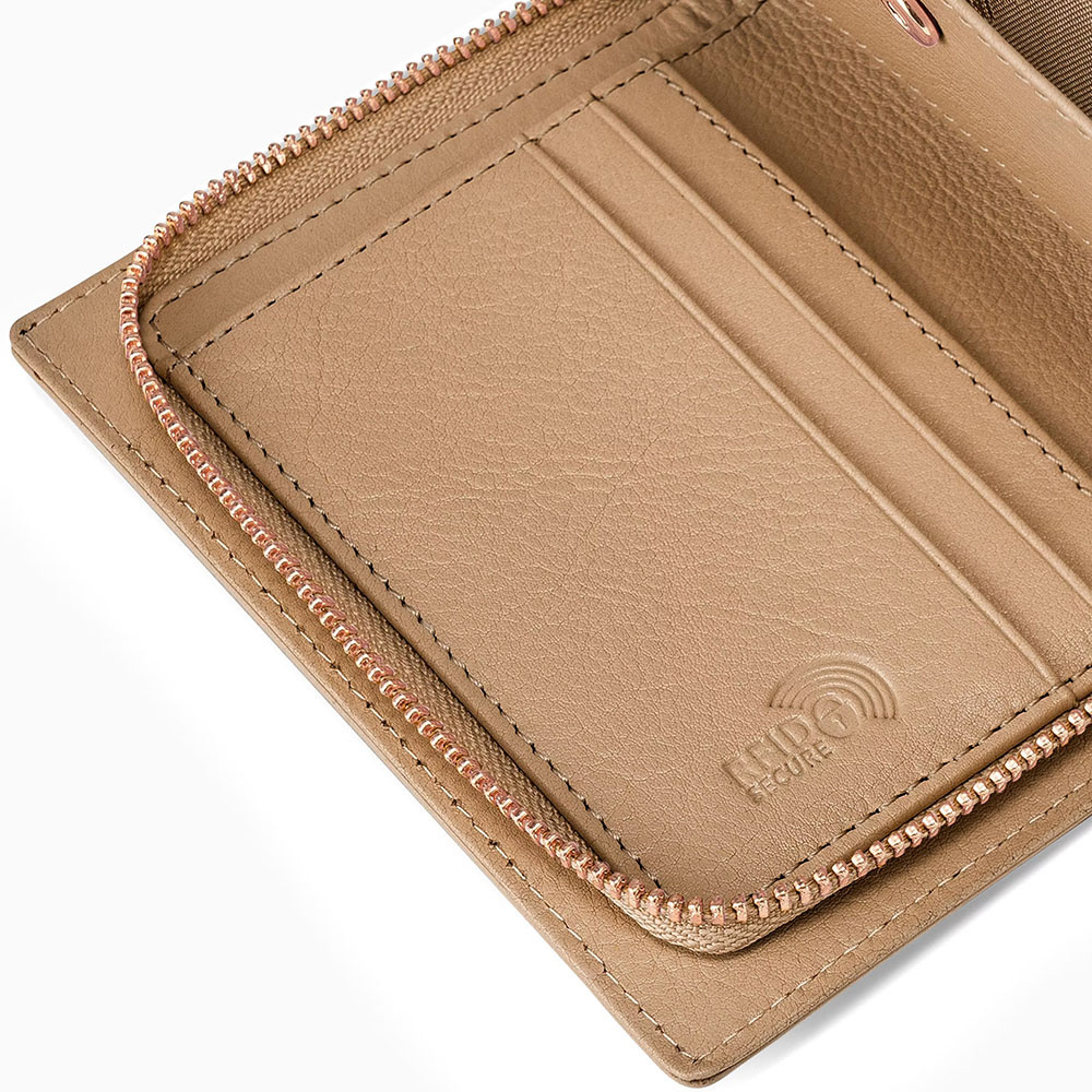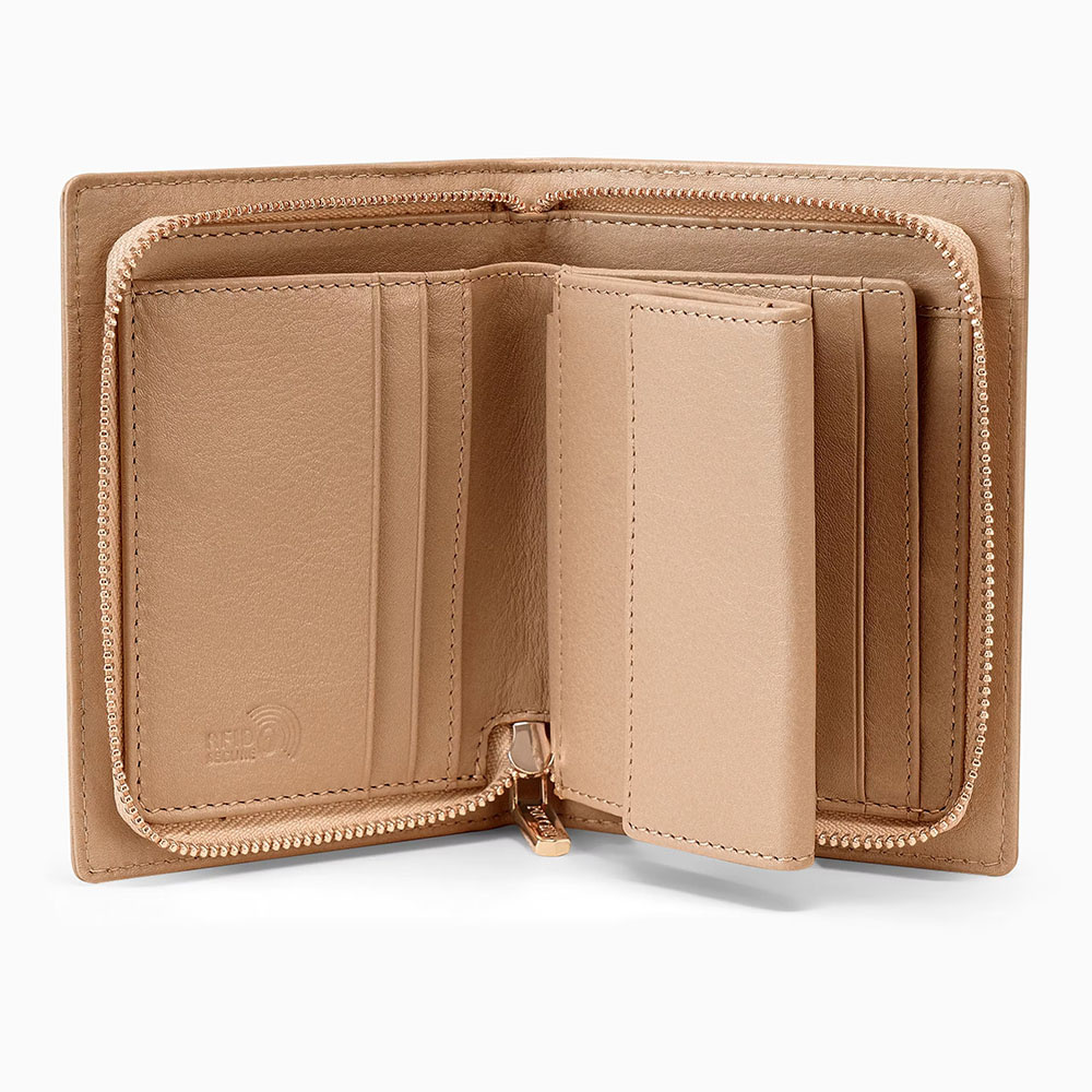 Dzięki średniemu rozmiarowi portfel doskonale mieści się w dłoni i w torebce, zapewniając pełen komfort użytkowania. Wnętrze zaprojektowano tak, by pomieściło wszystko, co najważniejsze – miejsce na banknoty, sześć przegródek na karty lub wizytówki oraz kieszonkę na bilon zapinaną na zatrzask. Całość zabezpieczono praktycznym zamkiem, który chroni zawartość przed wypadnięciem.