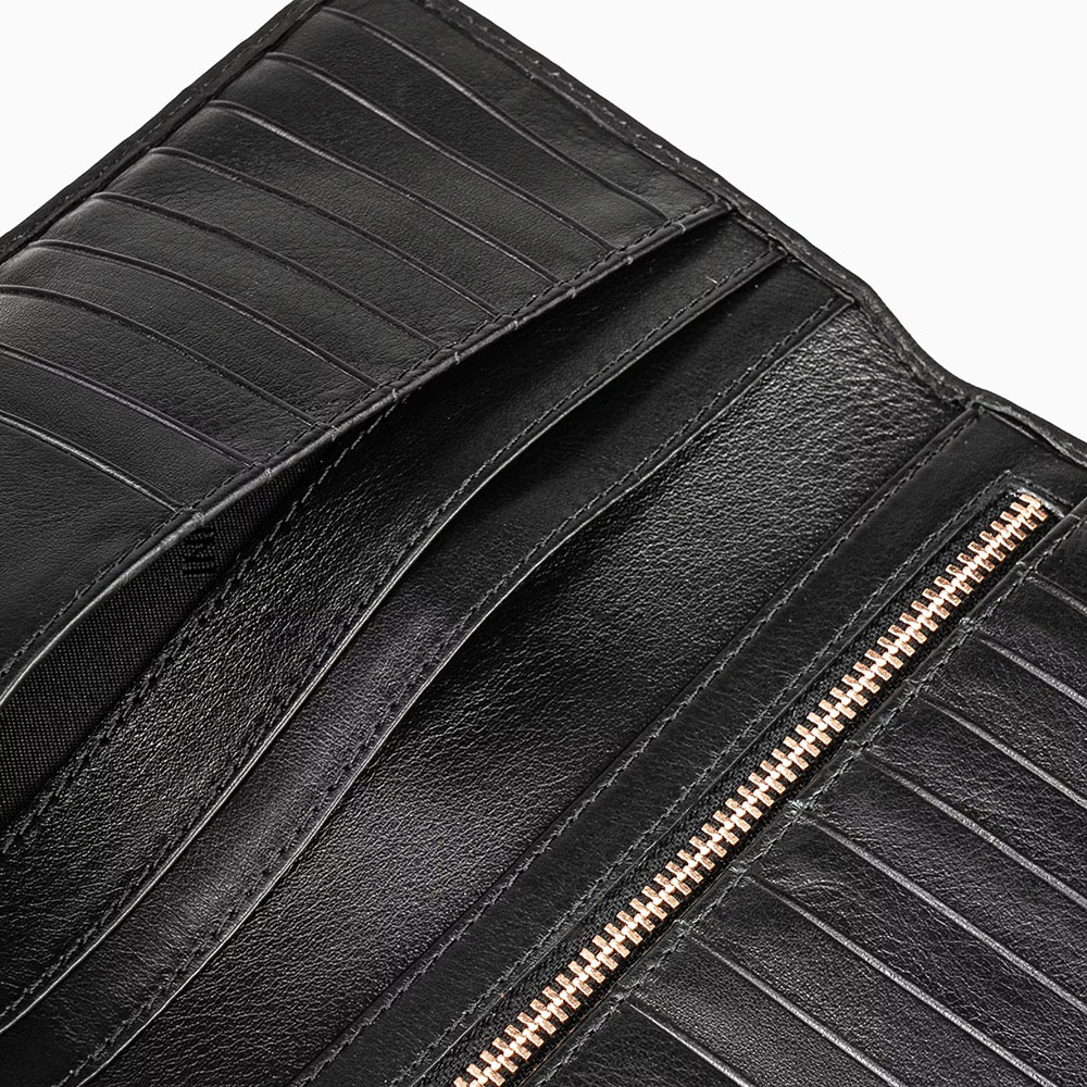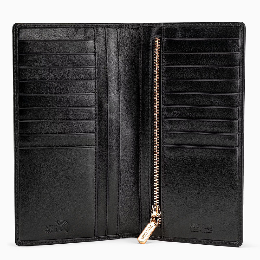Dzięki pionowej orientacji, portfel wygodnie leży w dłoni, zapewniając pełen komfort użytkowania. Wewnątrz znajduje się aż 18 przegródek na karty lub wizytówki oraz 4 duże przegrody, idealne na banknoty, paragony lub większe dokumenty. Dodatkowo, wewnętrzna kieszonka na bilon zapinana na zamek gwarantuje bezpieczne przechowywanie monet i drobiazgów.