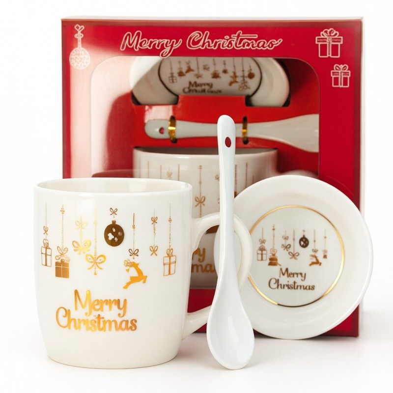 KUBEK CERAMICZNY z motywem świątecznym Zestaw z pokrywką i łyżeczką Idealny gadżet dla każdego miłośnika kawy czy herbaty.