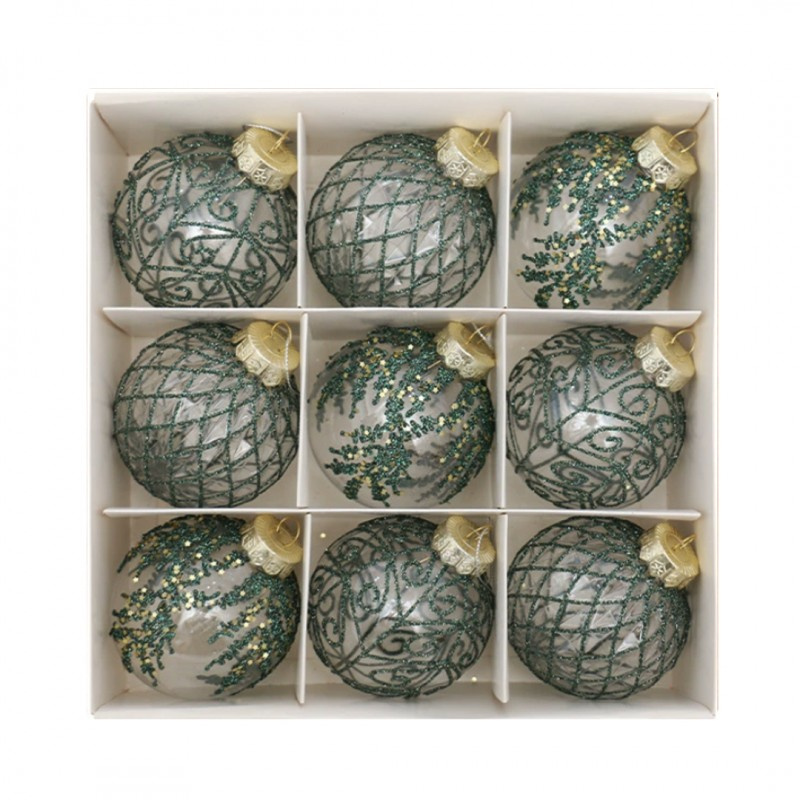 Specyfikacja: Zestaw 9 sztuk Średnica bombki: 8 cm Kolor: zielony Materiał: tworzywo sztuczne Wymiary opakowania: 24,5 x 24,5 x 8 cm