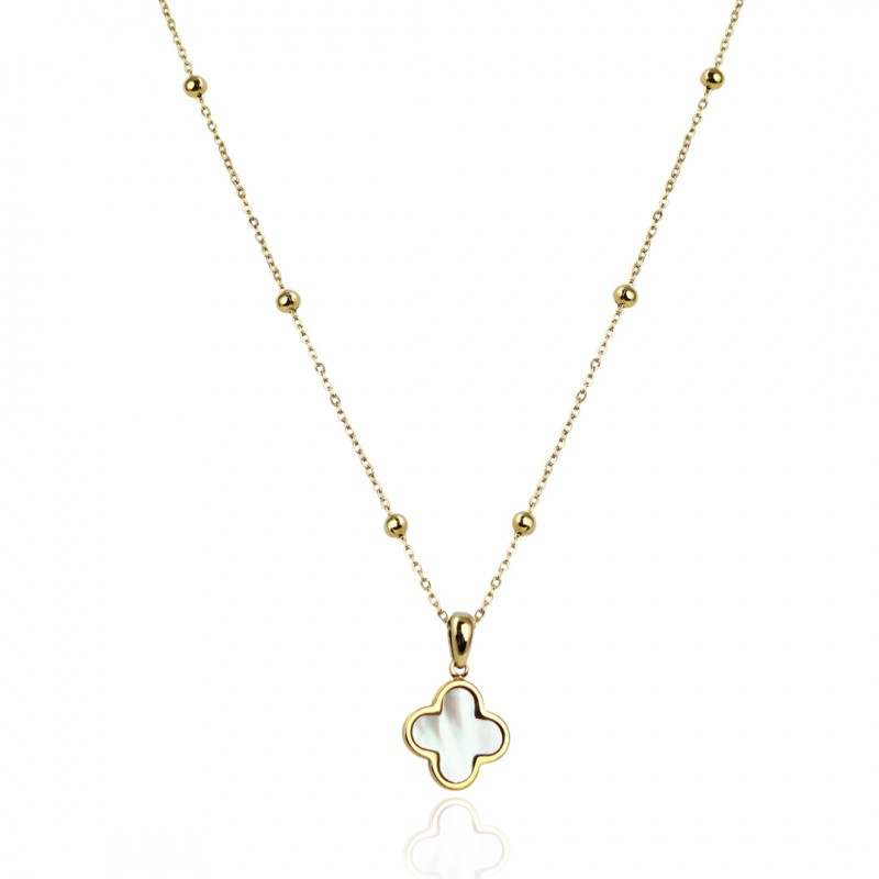 WYMIARY: - długość łańcuszka: 40cm - długość regulacji: 5cm Wymiary kartonika: 12cm x 10cm Waga: 3g / 12g brutto Kolor: jasny odcień złota Biżuteria ze stali