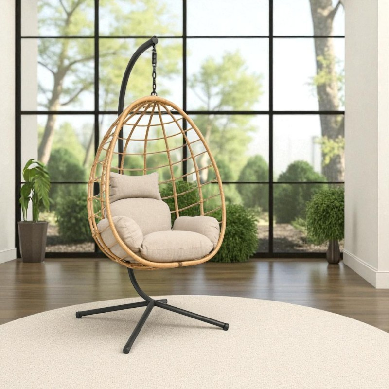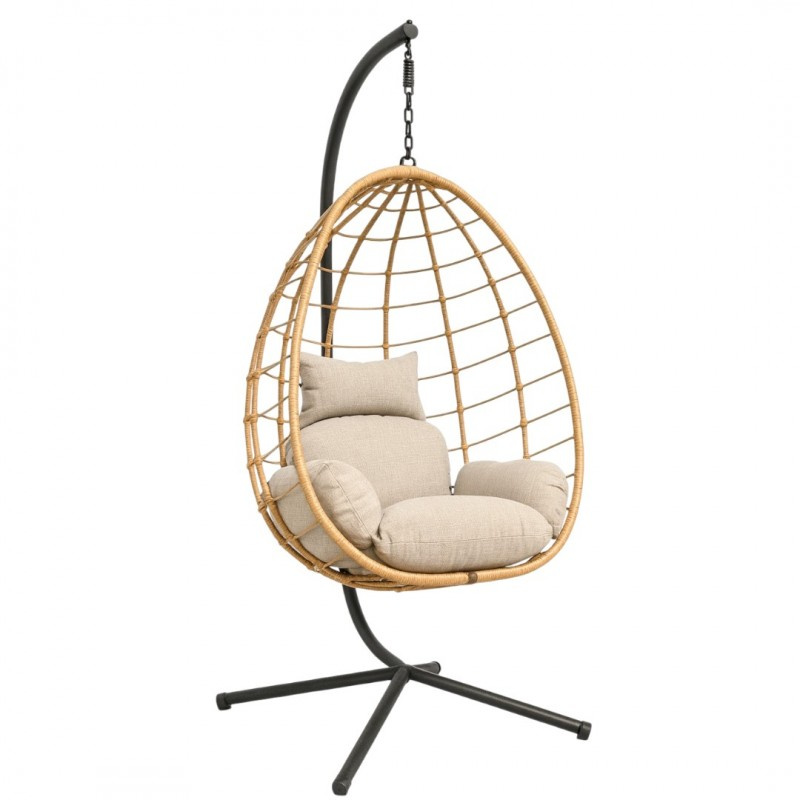Fotel wiszący huśtawka, kokon składany brązowy z beżowymi poduszkami KR37BR