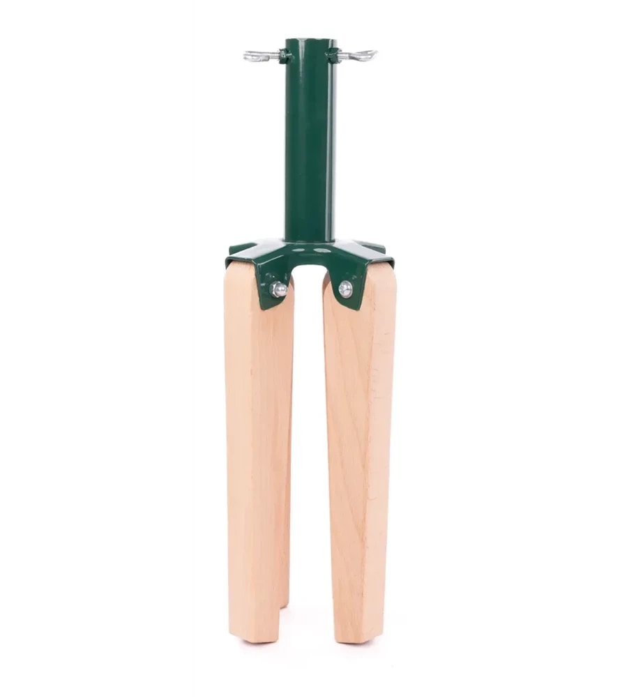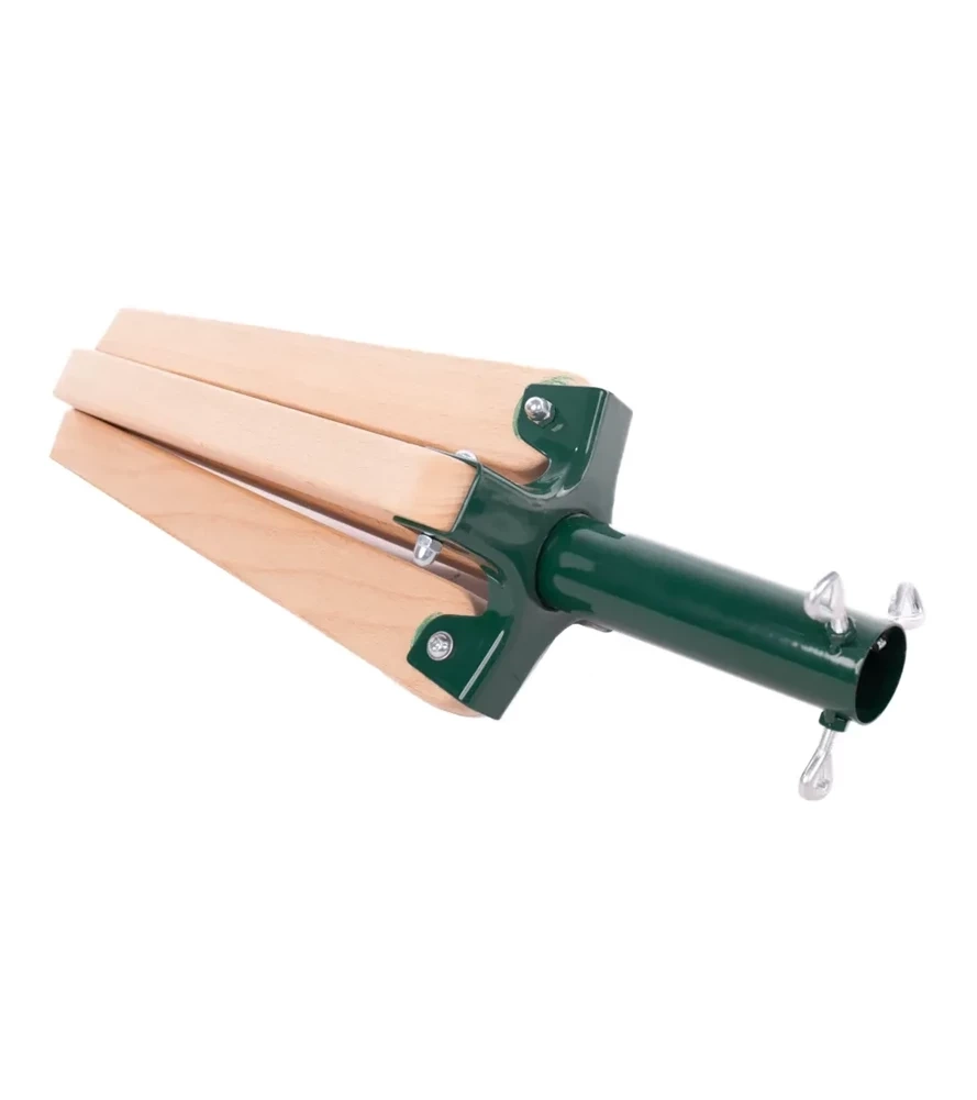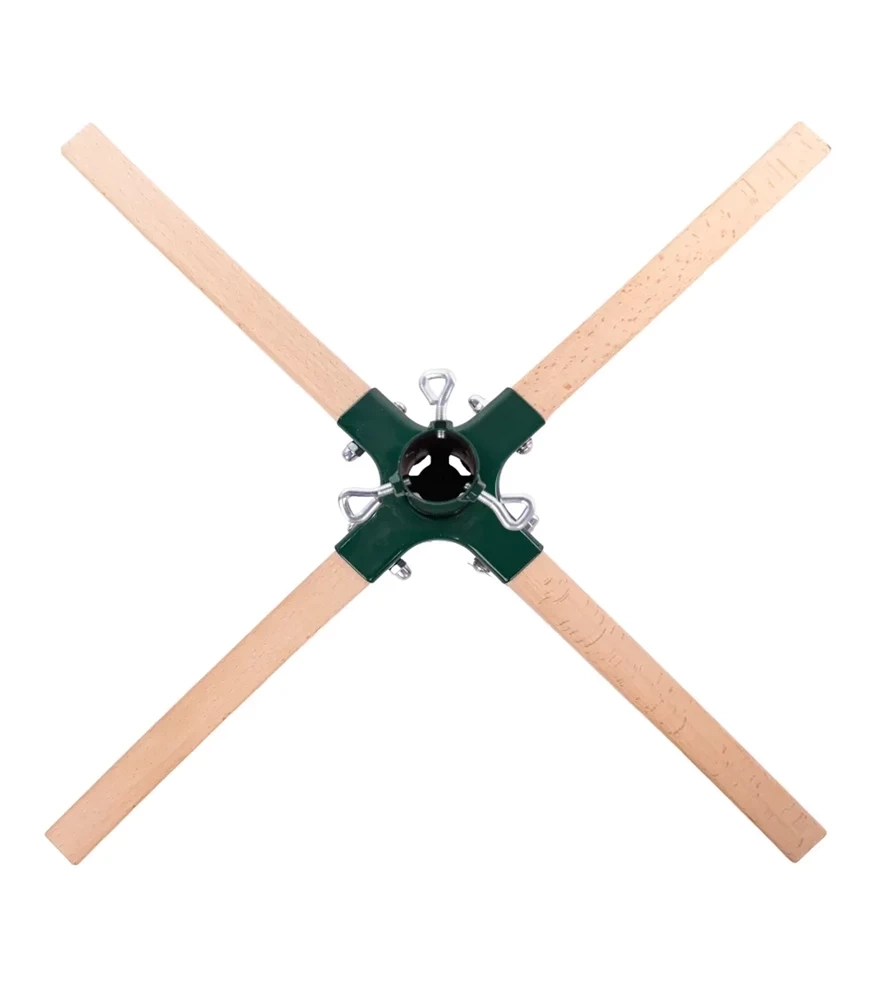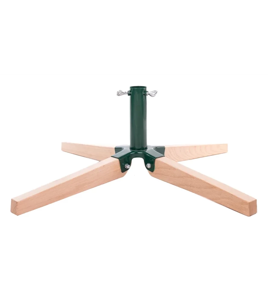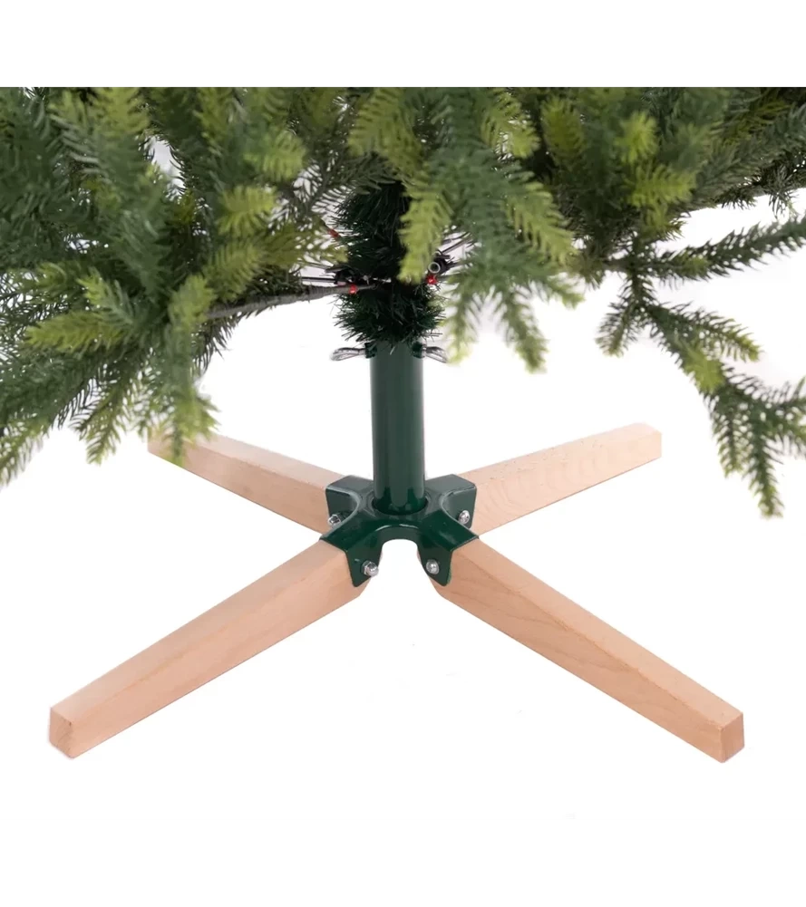 Stojak został zaprojektowany z myślą o trwałości i estetyce. Cztery rozkładane ramiona z jasnego drewna zapewniają szeroką i stabilną podstawę, minimalizując ryzyko przewrócenia. Centralny element – tuleja na pień wykonana z metalu w kolorze zielonym – jest odporny na uszkodzenia i doskonale komponuje się ze sztuczną choinką.