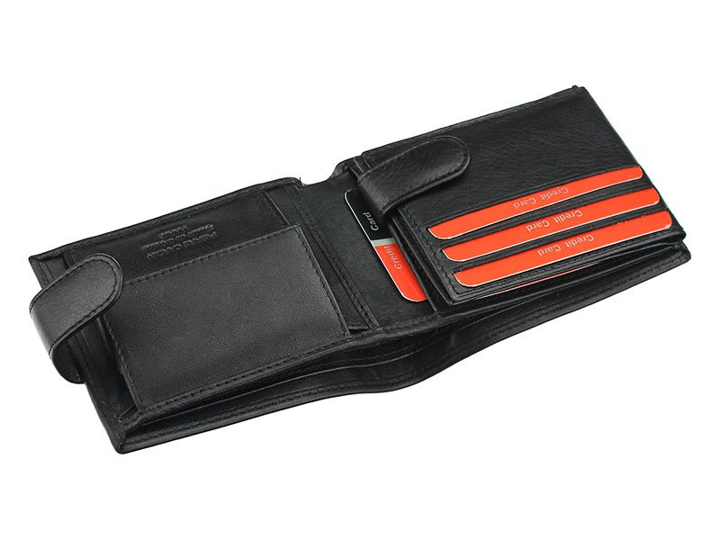 Nieduży portfel męski, wykonany z najwyższej jakości, naturalnej włoskiej skóry licowej. Budowa portfela: - orientacja pozioma, - dwie przegrody na banknoty, - dziewięć przegródek na karty magnetyczne, - dwa "okienka" na zdjęcie, - kieszeń na drobne, zamykana na zatrzask, - całość zamykana patką z zatrzaskiem, - na froncie portfela umieszczono metalowe logo producenta. Portfel dostarczany jest w oryginalnym pudełku - doskonale nadaje się na prezent.