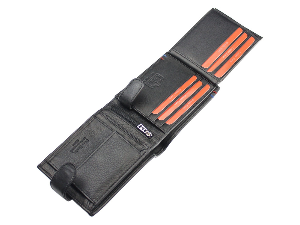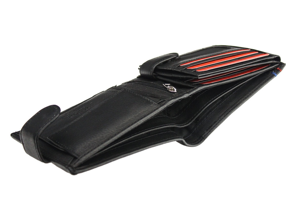 Elegancki portfel męski, wykonany z najwyższej jakości, naturalnej, matowej włoskiej skóry licowej. Budowa portfela: - orientacja pozioma, - dwie przegrody na banknoty, - dziewięć przegródek na karty magnetyczne, - dwa "okienka" na zdjęcie, - kieszeń na drobne, zamykana na zatrzask, - całość zamykana patką z zatrzaskiem.