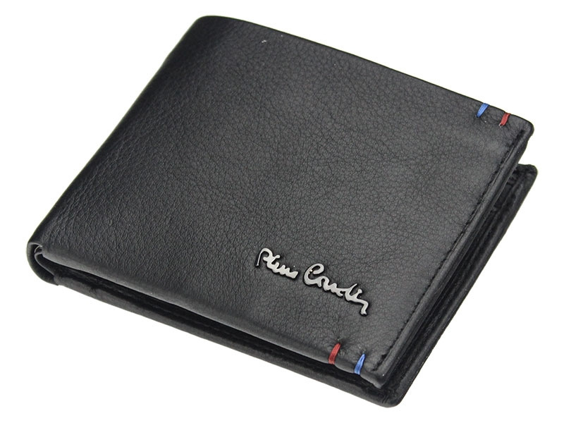 Nieduży portfel męski, prestiżowej marki Pierre Cardin, wykonany z najwyższej jakości, naturalnej, miękkiej włoskiej skóry licowej. Budowa portfela: - orientacja pozioma, - dwie przegrody na banknoty, - cztery przegródki na karty magnetyczne, - kieszeń na drobne, zamykana na zatrzask, - na froncie portfela umieszczono metalowe logo producenta.