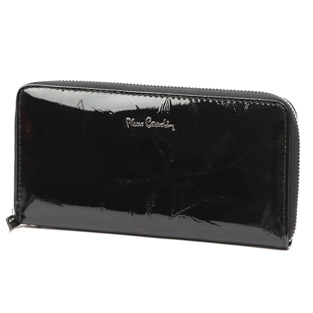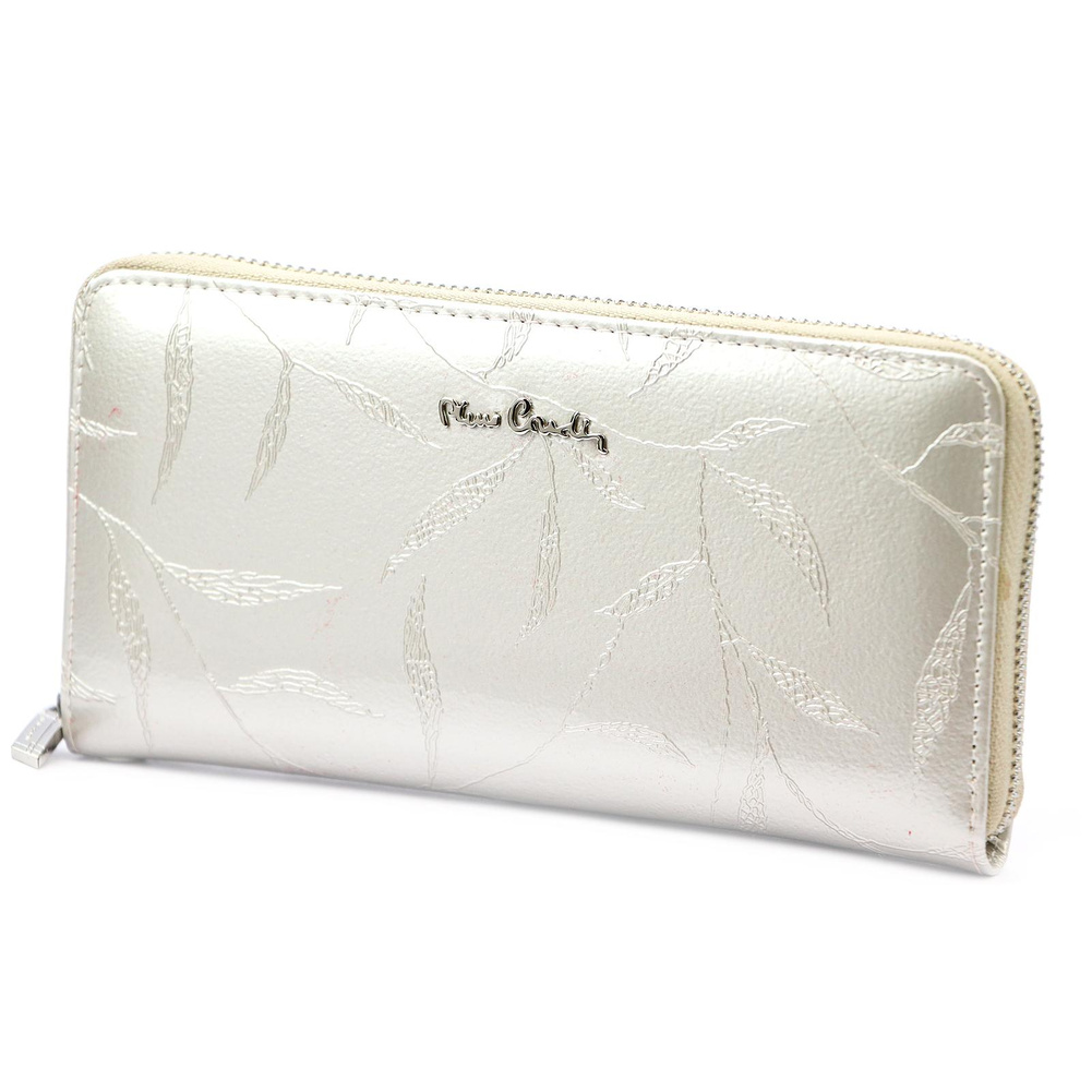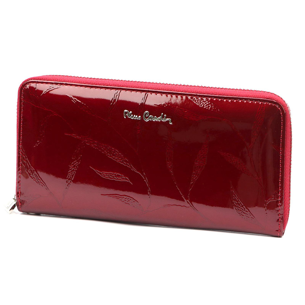 Duży portfel damski typu "piórnik", wykonany z najwyższej jakości naturalnej, włoskiej skóry licowej lakierowanej, z wytłoczonym, delikatnym motywem liści. Budowa portfela: - orientacja pozioma, - dwie przegrody na banknoty, - szesnaście przegródek na karty magnetyczne, - "okienko" na zdjęcie, - kieszeń na drobne, zamykana na zamek błyskawiczny, - całość zamykana mocnym, metalowym zamkiem błyskawicznym. Do portfela dołączono dopinaną "rączkę", która pozwala go nosić w ręku, jak kopertówkę. Portfel dostarczany jest w oryginalnym, firmowym pudełku - idealny na prezent.