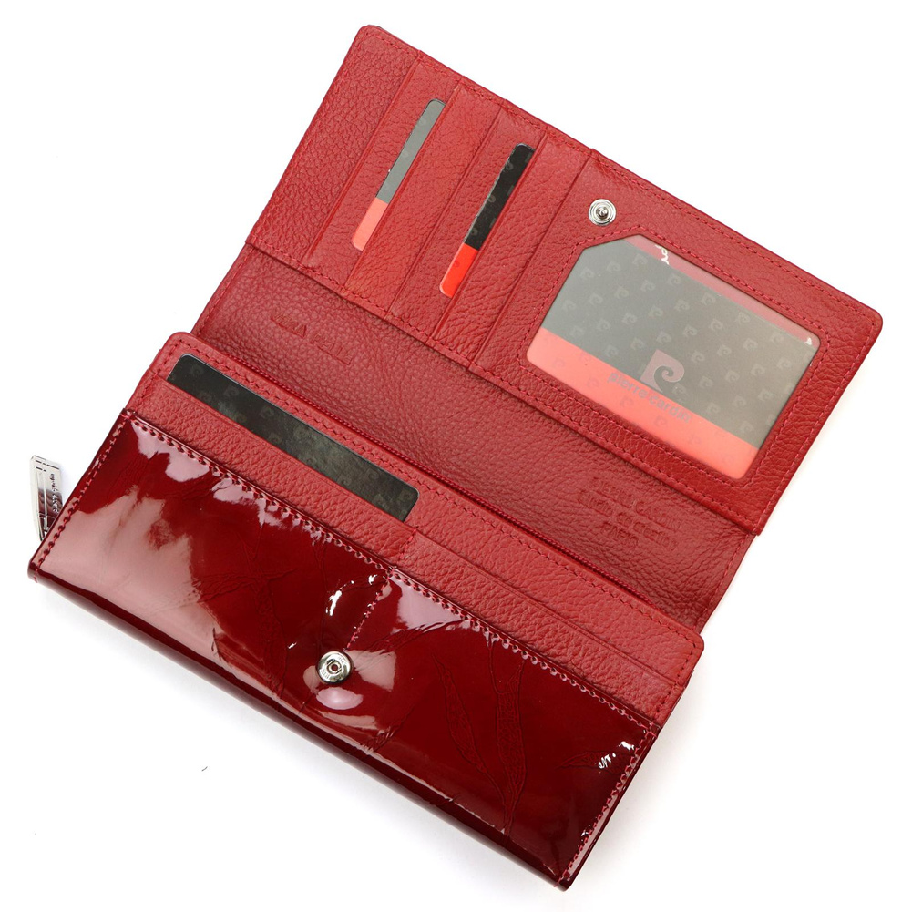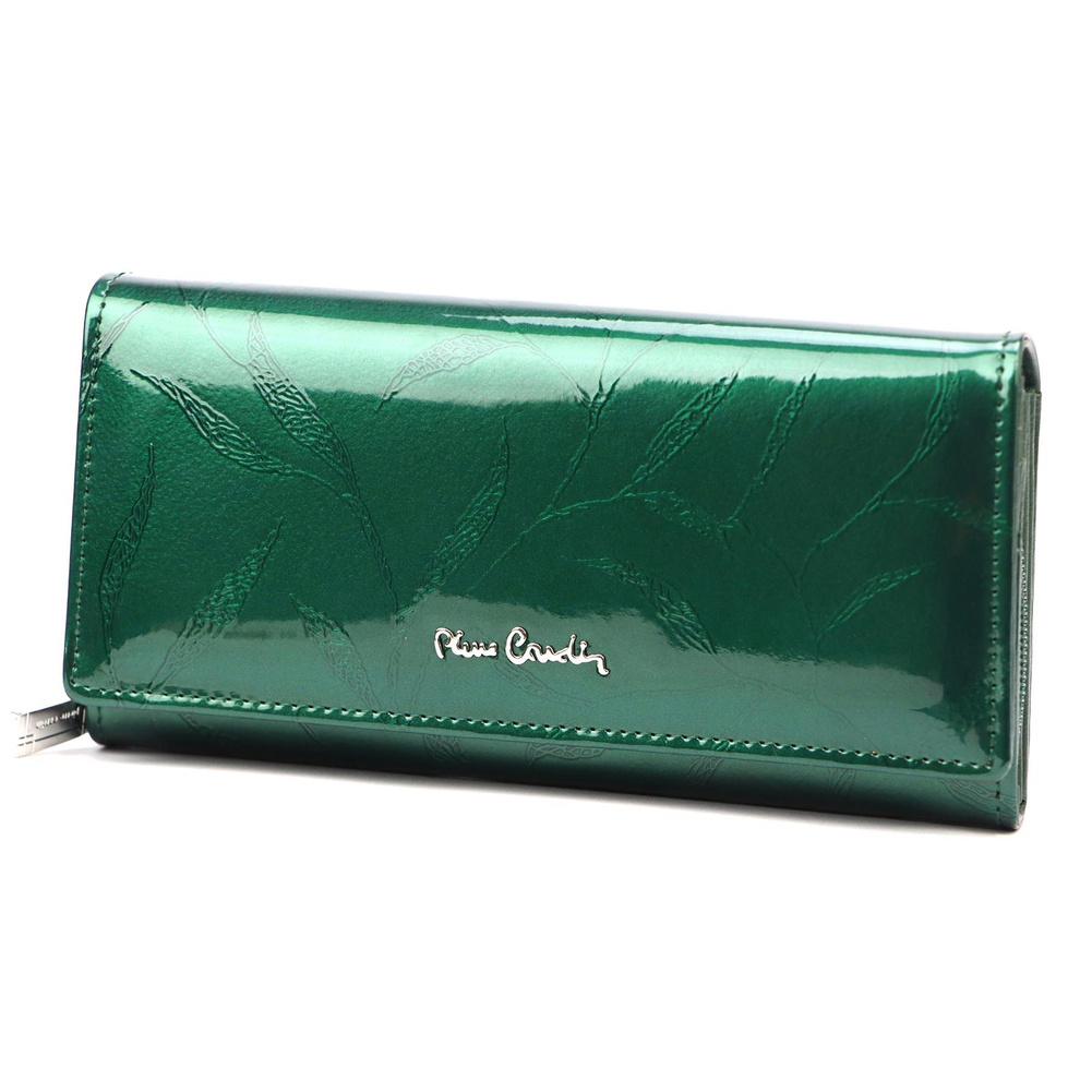 Duży portfel damski, wykonany z najwyższej jakości naturalnej, włoskiej skóry licowej lakierowanej, z wytłoczonym, delikatnym motywem liści. Budowa portfela: - orientacja pozioma, - dwie przegrody na banknoty (w jedną z przegród wszyto kieszonkę zapinaną na suwak), - osiem przegródek na karty magnetyczne, - "okienko" na zdjęcie, - kieszeń na drobne, podzielona na dwie części, zamykana na zamek błyskawiczny, - całość zamykana klapą z zatrzaskiem. Portfel dostarczany jest w oryginalnym, firmowym pudełku - idealny na prezent.