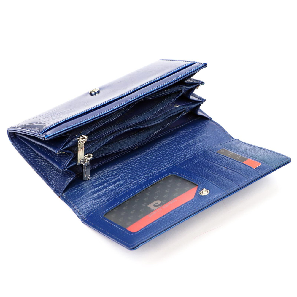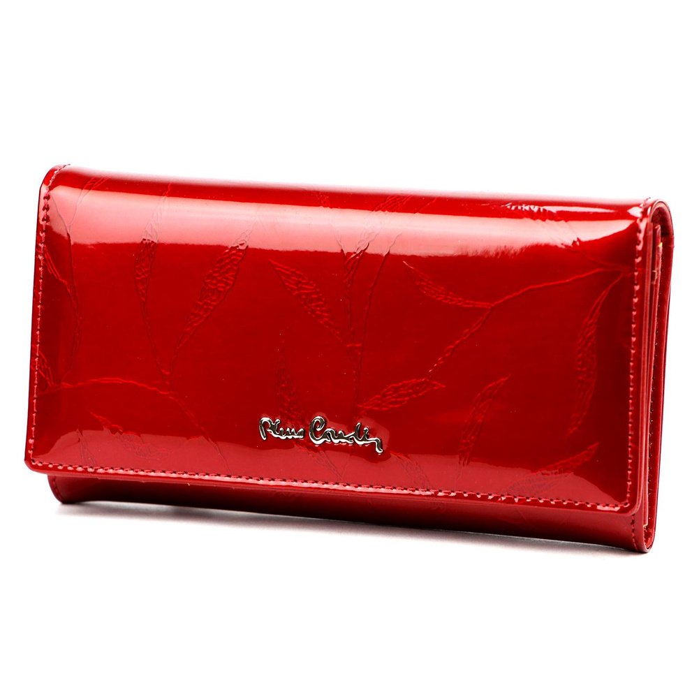 Duży portfel damski, wykonany z najwyższej jakości naturalnej, włoskiej skóry licowej lakierowanej, z wytłoczonym, delikatnym motywem liści. Budowa portfela: - orientacja pozioma, - trzy przegrody na banknoty (w dwie z przegród wszyto kieszonki zapinane na suwak), - siedem przegródek na karty magnetyczne, - "okienko" na zdjęcie, - całość zamykana klapą z zatrzaskiem. Portfel dostarczany jest w oryginalnym, firmowym pudełku - idealny na prezent.