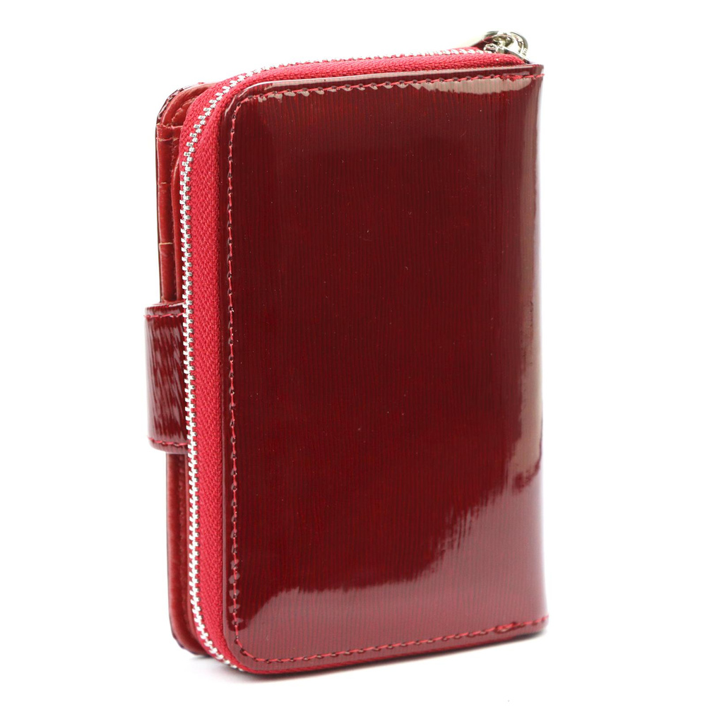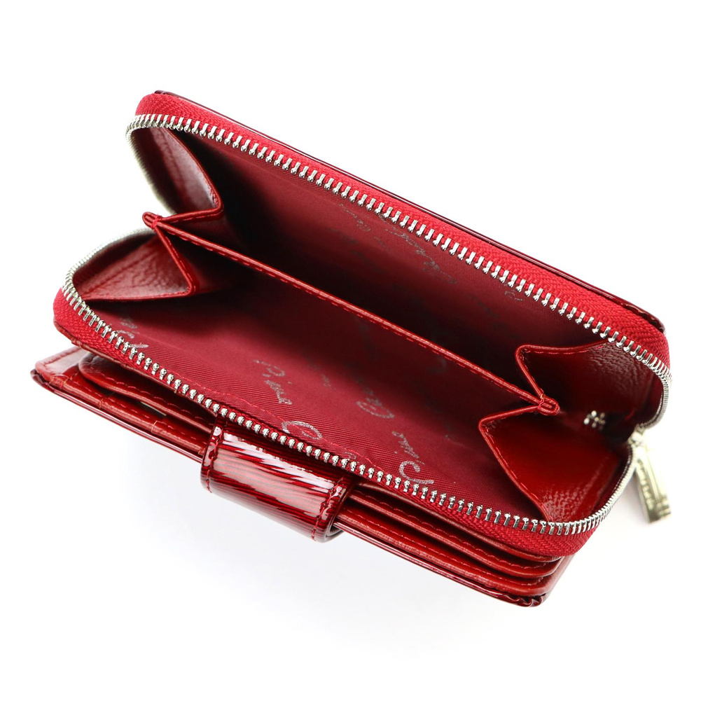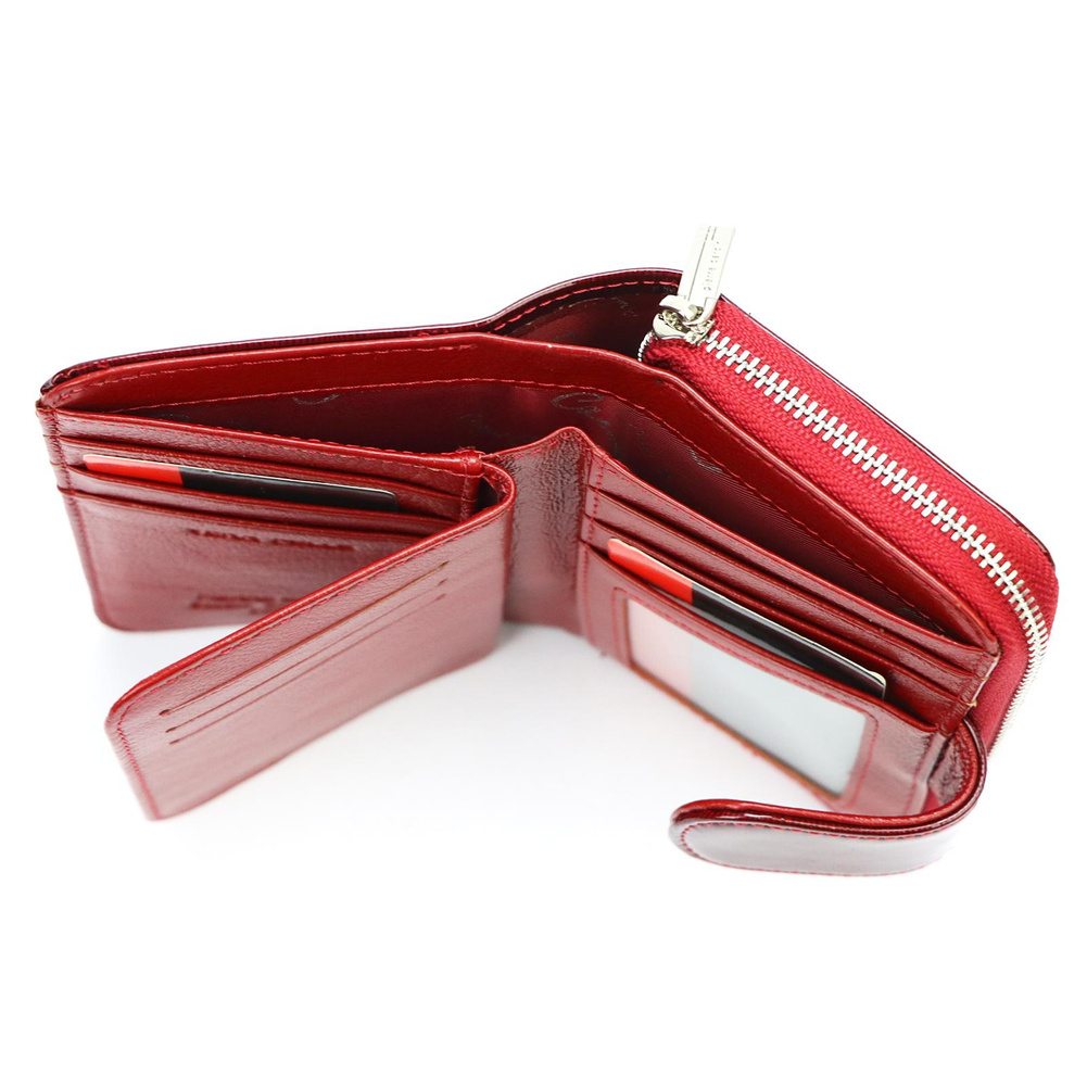 Nieduży portfel damski, wykonany z najwyższej jakości naturalnej, włoskiej skóry licowej lakierowanej. Budowa portfela: - orientacja pionowa, - przegródka na banknoty, - osiem przegródek na karty magnetyczne, - dwa "okienka" na zdjęcie, - kieszeń na drobne, podzielona na dwie części, zamykana na zamek błyskawiczny, - całość zamykana patką z zatrzaskiem. Portfel dostarczany jest w oryginalnym, firmowym pudełku - idealny na prezent.