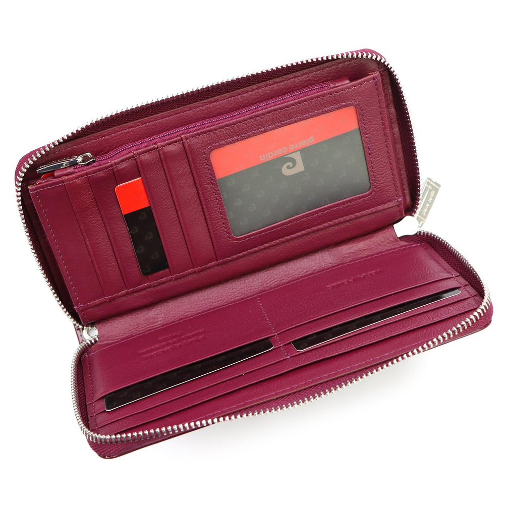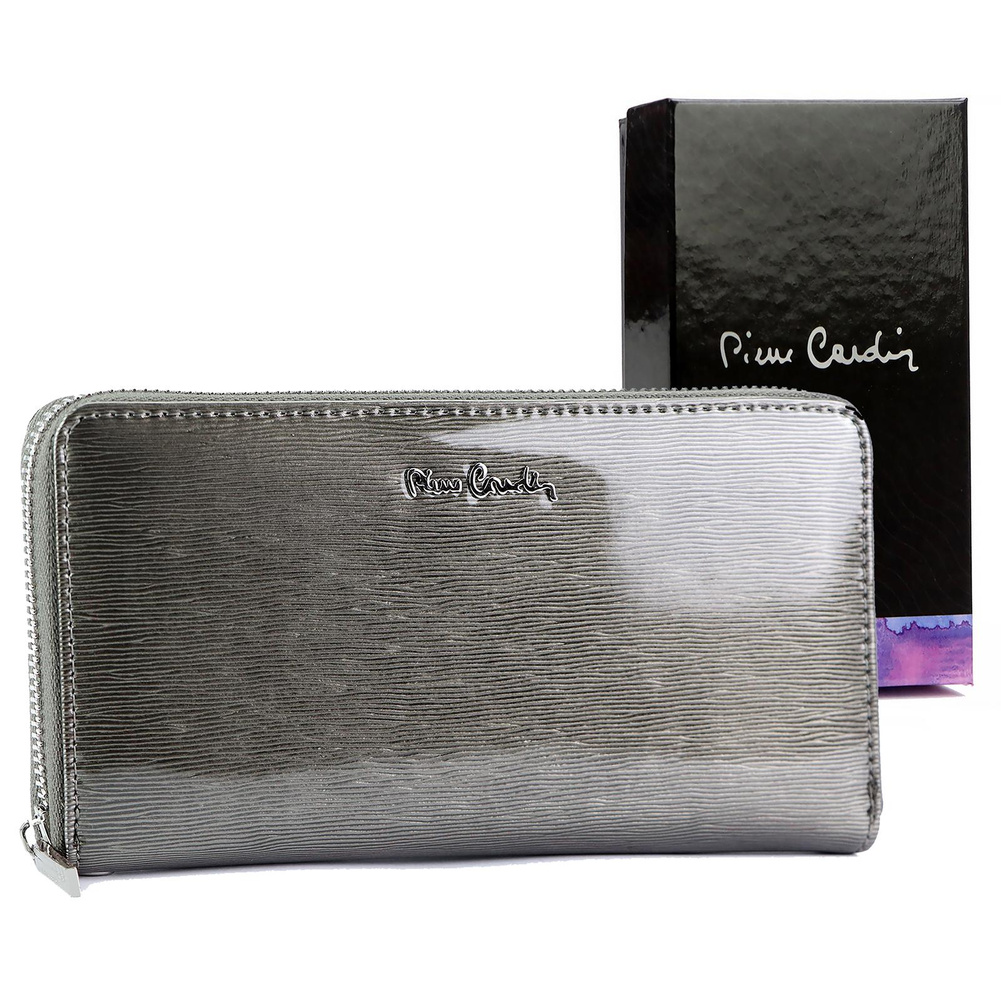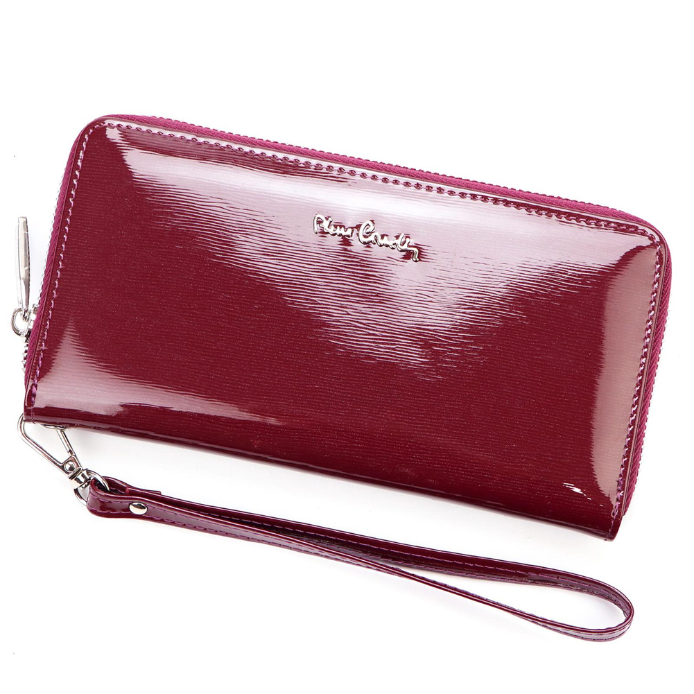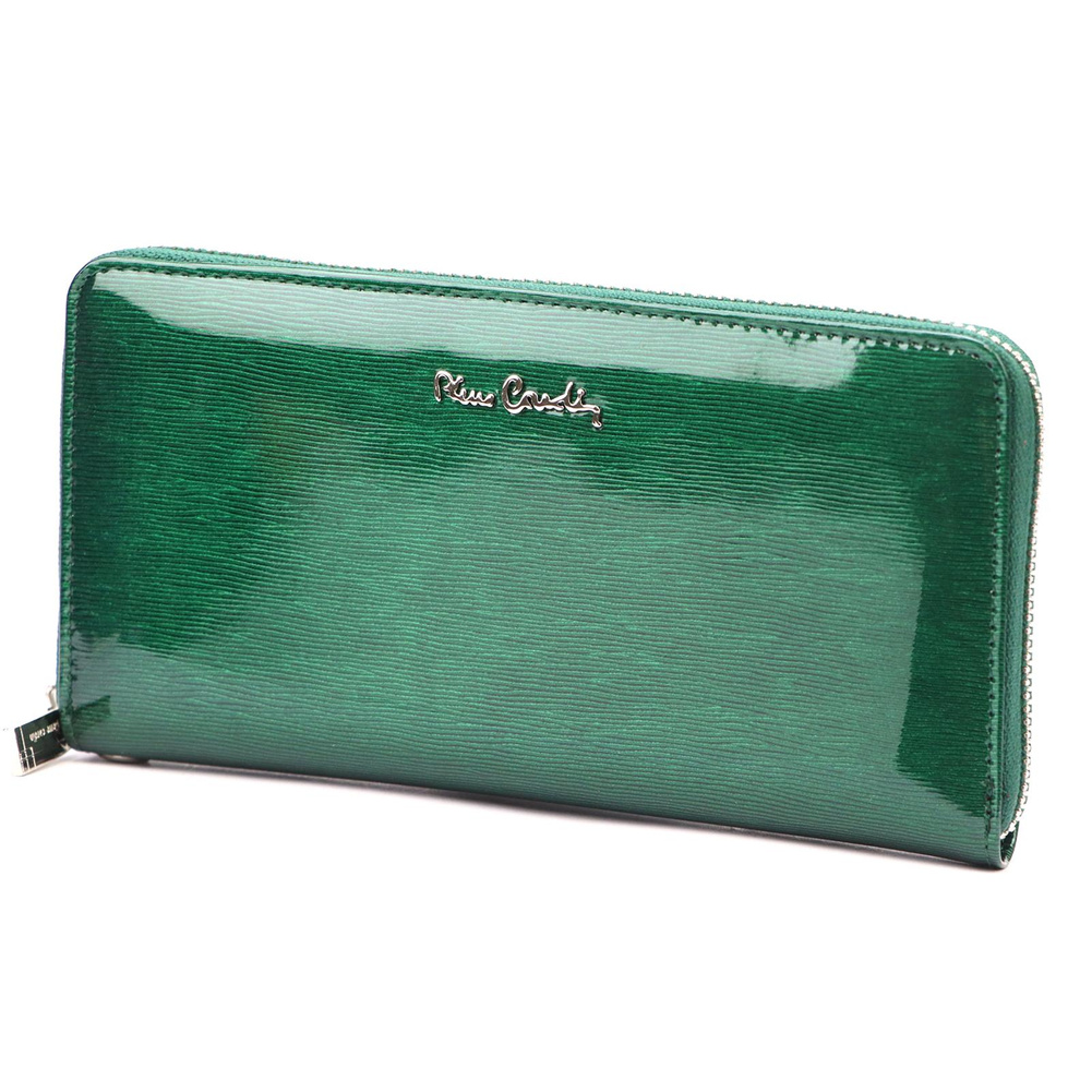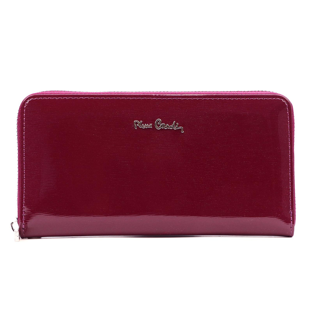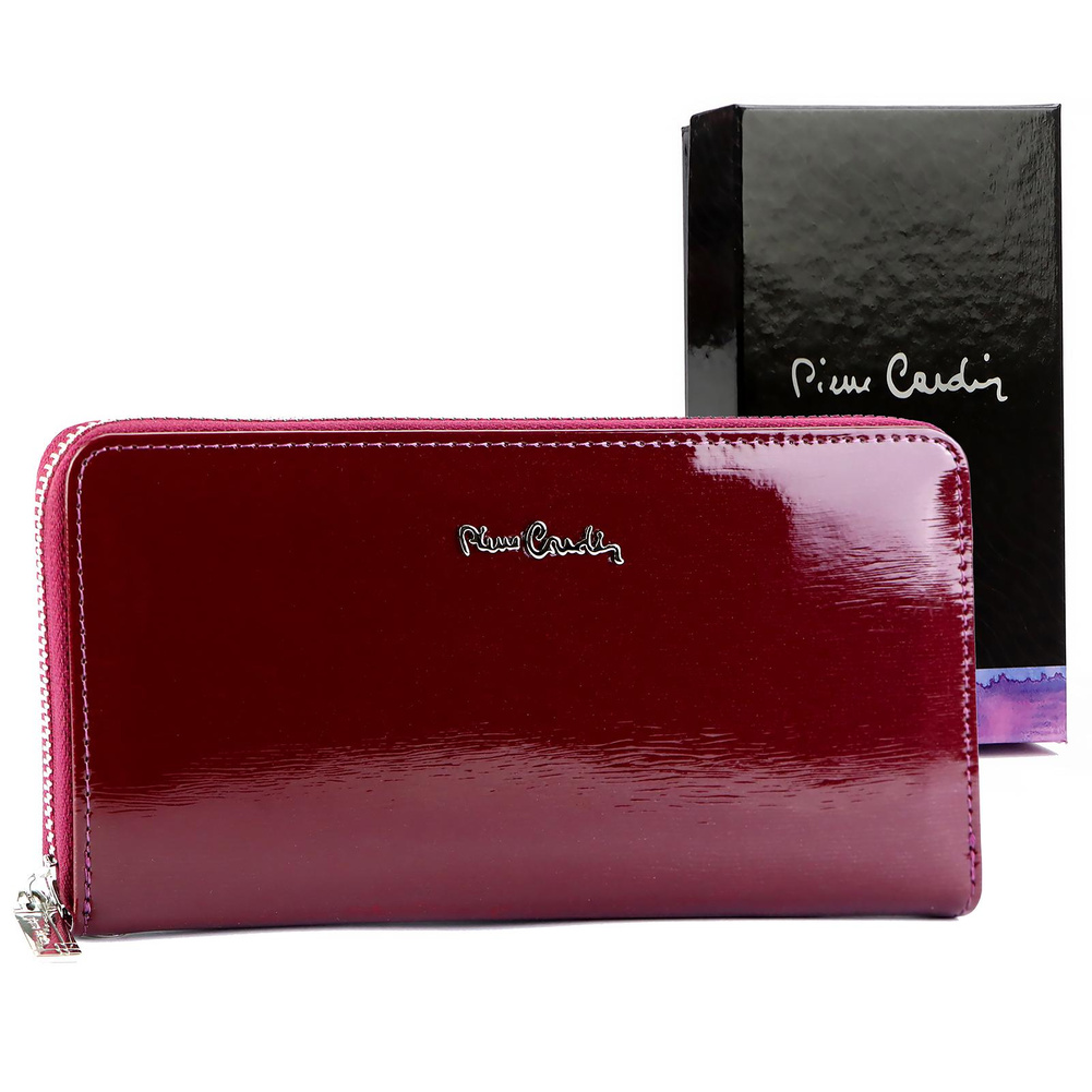 Duży portfel damski typu "piórnik", wykonany z najwyższej jakości naturalnej, włoskiej skóry licowej lakierowanej. Budowa portfela: - orientacja pozioma, - dwie przegrody na banknoty, - szesnaście przegródek na karty magnetyczne, - "okienko" na zdjęcie, - kieszeń na drobne, zamykana na zamek błyskawiczny, - całość zamykana mocnym, metalowym zamkiem błyskawicznym. Do portfela dołączono dopinaną "rączkę", która pozwala go nosić w ręku, jak kopertówkę. Portfel dostarczany jest w oryginalnym, firmowym pudełku - idealny na prezent.