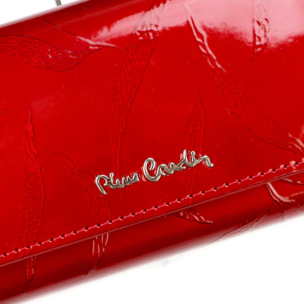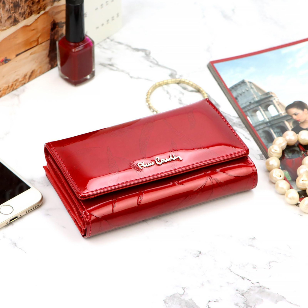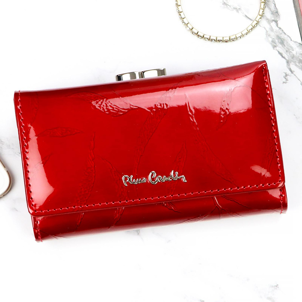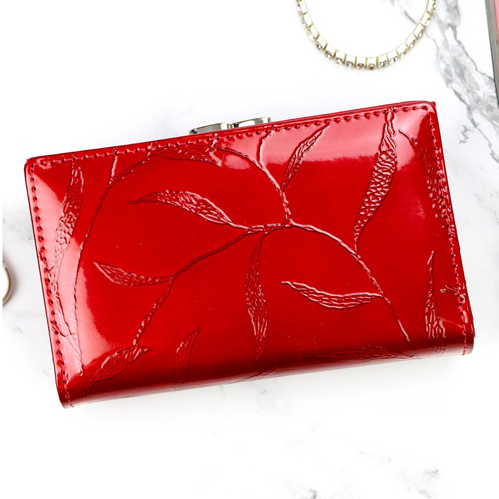 Średniej wielkości portfel damski, wykonany z najwyższej jakości naturalnej, włoskiej skóry licowej lakierowanej, z wytłoczonym, delikatnym motywem liści. Budowa portfela: - orientacja pozioma, - przegródka na banknoty, - dwanaście przegródek na karty magnetyczne, - dwa "okienka" na zdjęcie, - kieszeń na drobne, zamykana na "bigiel", - całość zamykana klapą z zatrzaskiem. Portfel dostarczany jest w oryginalnym, firmowym pudełku - idealny na prezent.