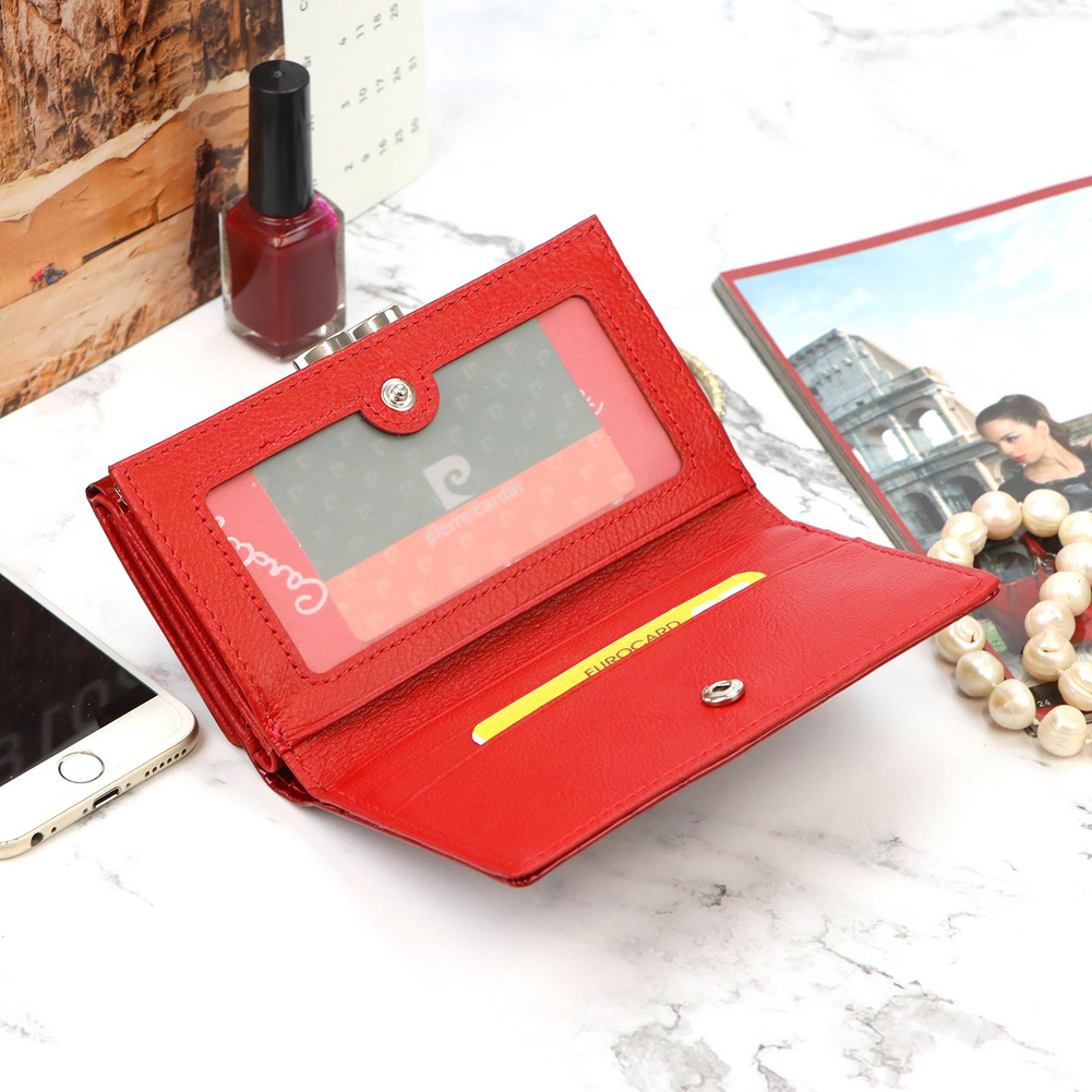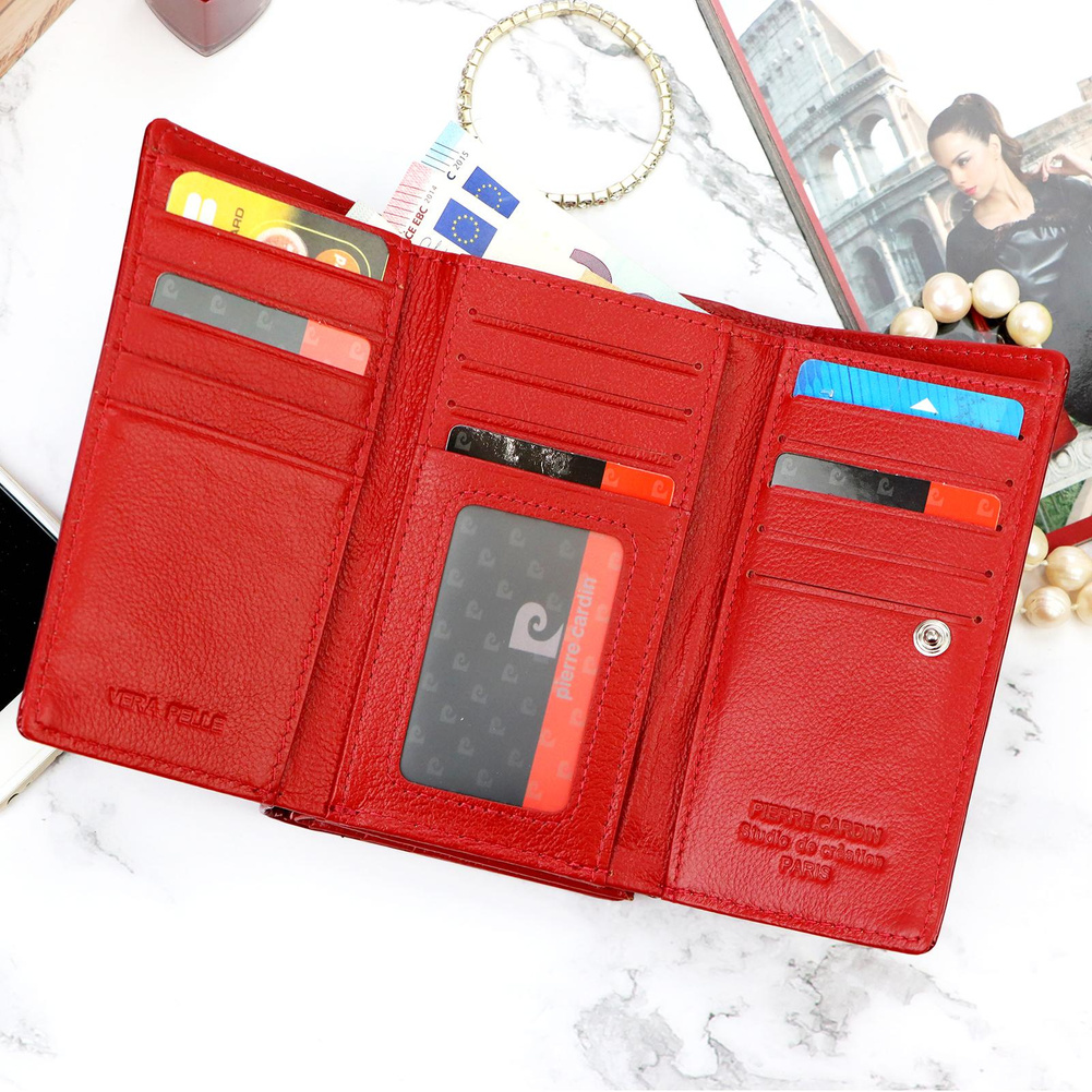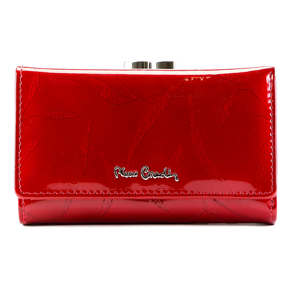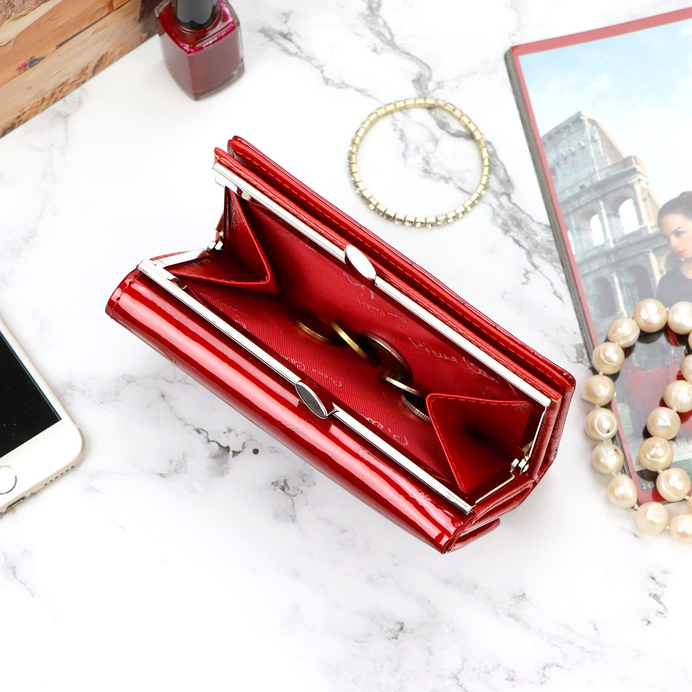 Średniej wielkości portfel damski, wykonany z najwyższej jakości naturalnej, włoskiej skóry licowej lakierowanej, z wytłoczonym, delikatnym motywem liści. Budowa portfela: - orientacja pozioma, - przegródka na banknoty, - dwanaście przegródek na karty magnetyczne, - dwa "okienka" na zdjęcie, - kieszeń na drobne, zamykana na "bigiel", - całość zamykana klapą z zatrzaskiem. Portfel dostarczany jest w oryginalnym, firmowym pudełku - idealny na prezent.