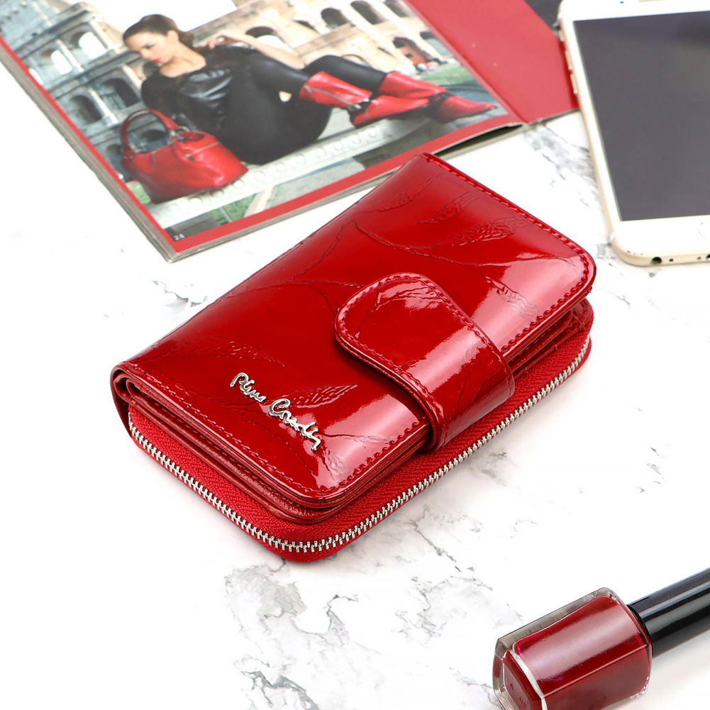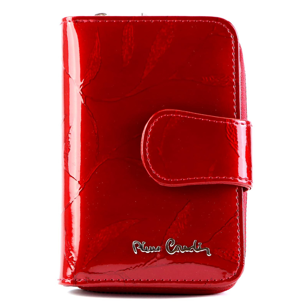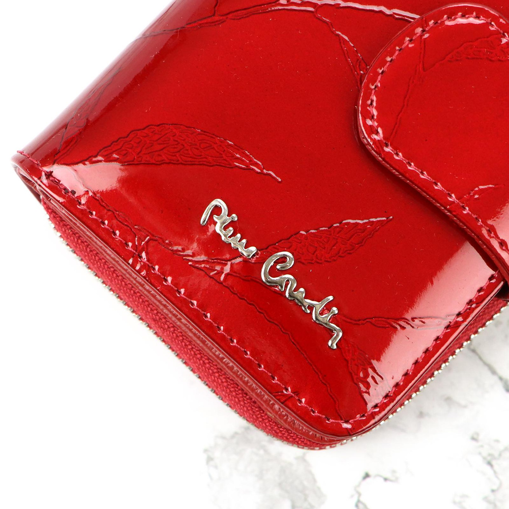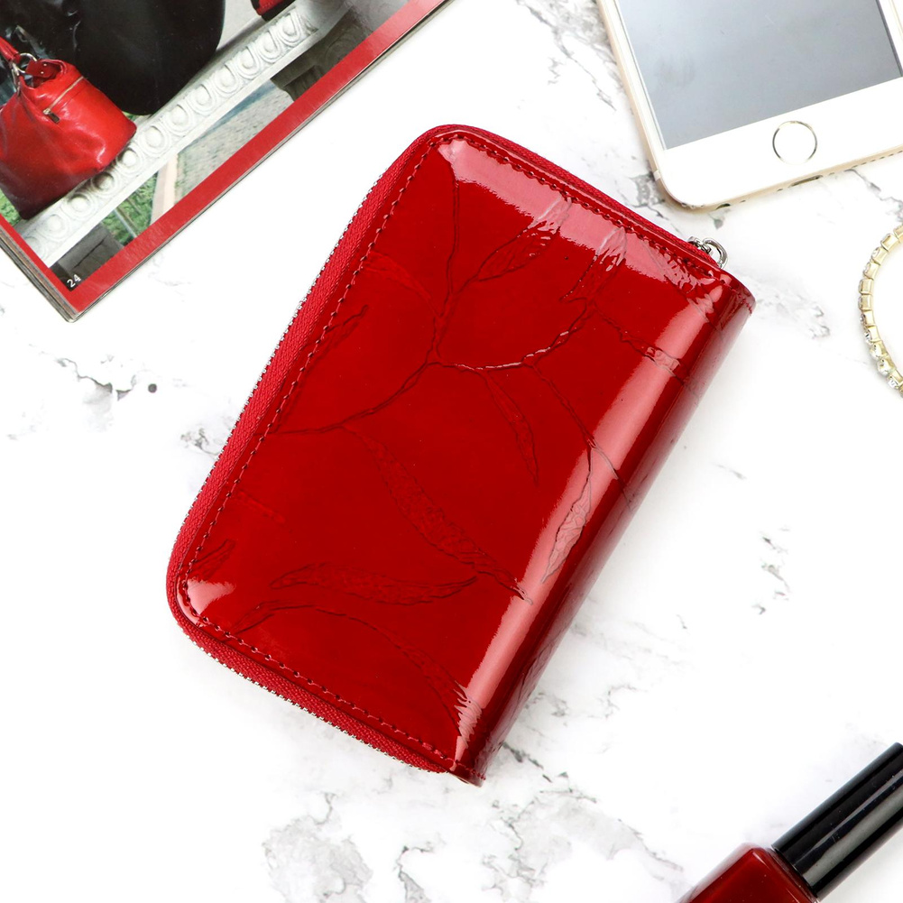 Nieduży portfel damski, wykonany z najwyższej jakości naturalnej, włoskiej skóry licowej lakierowanej, z wytłoczonym, delikatnym motywem liści. Budowa portfela: - orientacja pionowa, - przegródka na banknoty, - osiem przegródek na karty magnetyczne, - dwa "okienka" na zdjęcie, - kieszeń na drobne, podzielona na dwie części, zamykana na zamek błyskawiczny, - całość zamykana patką z zatrzaskiem. Portfel dostarczany jest w oryginalnym, firmowym pudełku - idealny na prezent.