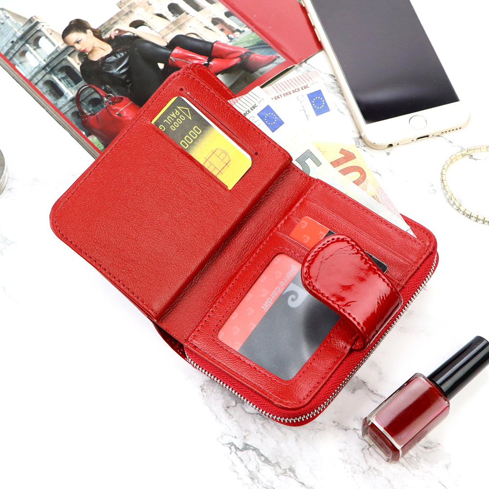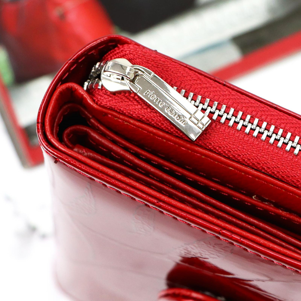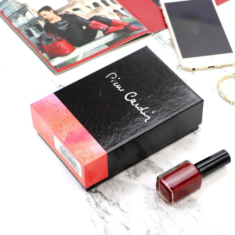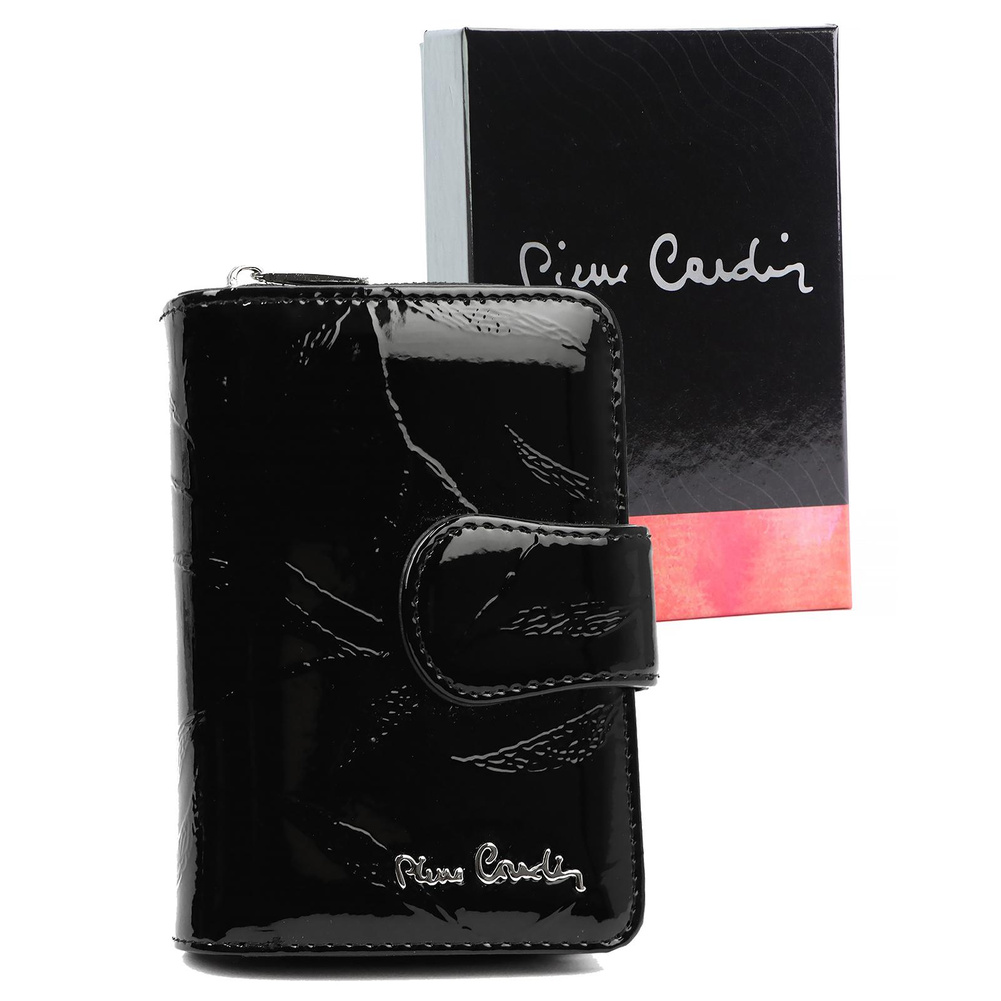 Nieduży portfel damski, wykonany z najwyższej jakości naturalnej, włoskiej skóry licowej lakierowanej, z wytłoczonym, delikatnym motywem liści. Budowa portfela: - orientacja pionowa, - przegródka na banknoty, - osiem przegródek na karty magnetyczne, - dwa "okienka" na zdjęcie, - kieszeń na drobne, podzielona na dwie części, zamykana na zamek błyskawiczny, - całość zamykana patką z zatrzaskiem. Portfel dostarczany jest w oryginalnym, firmowym pudełku - idealny na prezent.