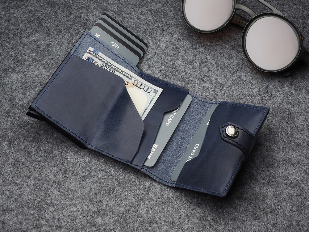 Dwie łatwo dostępne kieszonki idealnie zorganizują dokumenty, karty lub wizytówki. Dodatkowym atutem jest unikalna przegródka na banknoty, wykonana w całości ze skóry. Dzięki technologii blokowania RFID zastosowanej w designie portfela, Twoje wrażliwe dane oraz środki na kartach płatniczych są całkowicie bezpieczne i chronione przed nieautoryzowanym sczytaniem lub kradzieżą. Specjalny mechanizm stopniowego wysuwania kart pozwala szybko sięgnąć po tę, której szukamy.