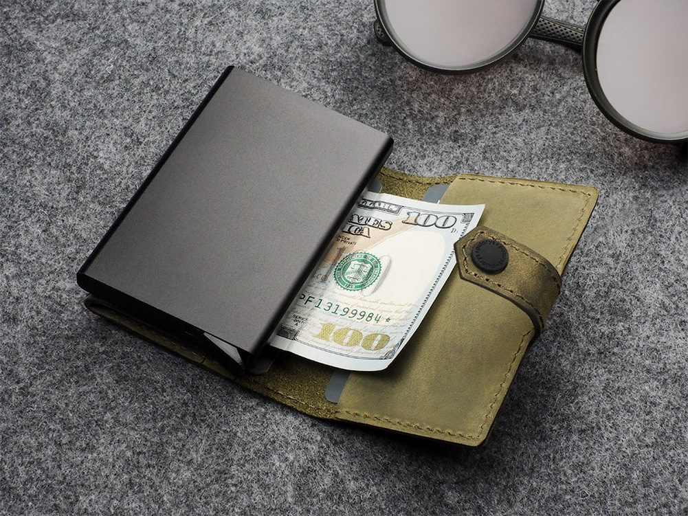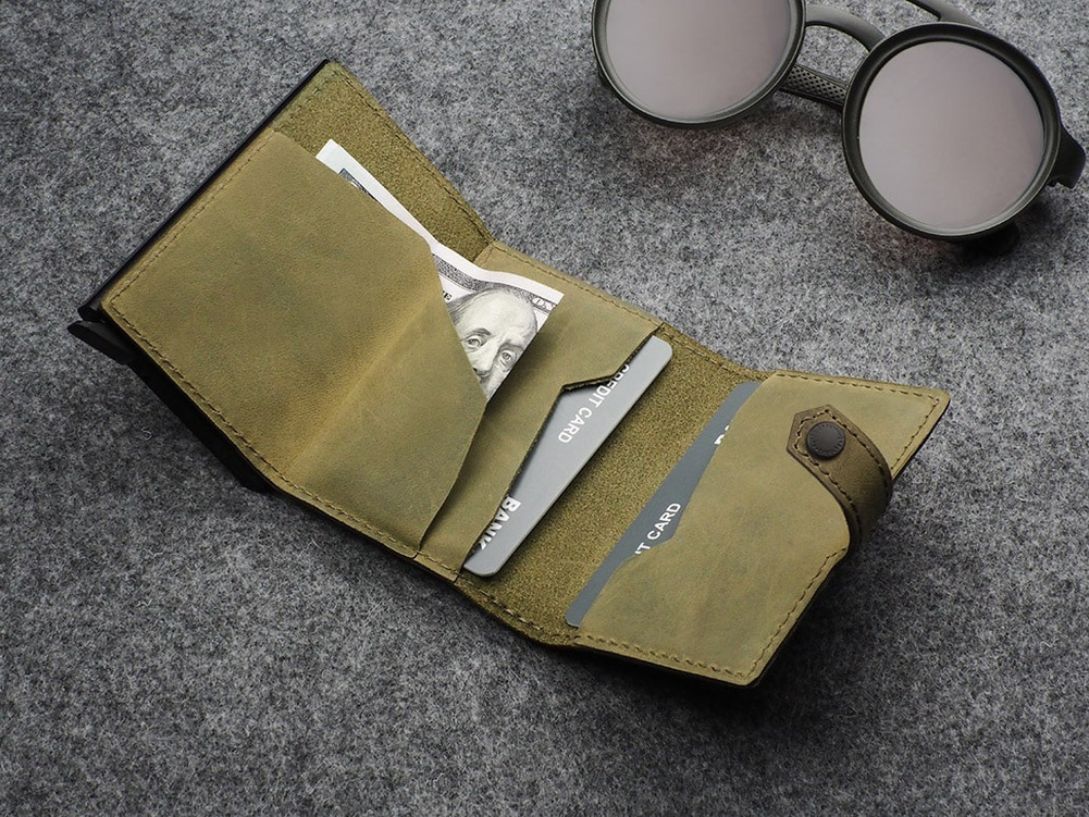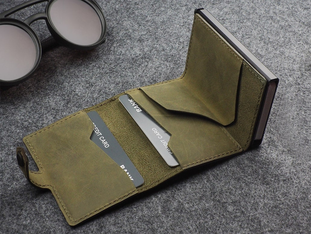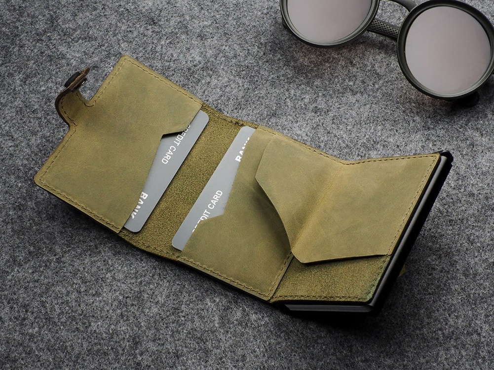 Dwie łatwo dostępne kieszonki idealnie zorganizują dokumenty, karty lub wizytówki. Dodatkowym atutem jest unikalna przegródka na banknoty, wykonana w całości ze skóry. Dzięki technologii blokowania RFID zastosowanej w designie portfela, Twoje wrażliwe dane oraz środki na kartach płatniczych są całkowicie bezpieczne i chronione przed nieautoryzowanym sczytaniem lub kradzieżą. Specjalny mechanizm stopniowego wysuwania kart pozwala szybko sięgnąć po tę, której szukamy.