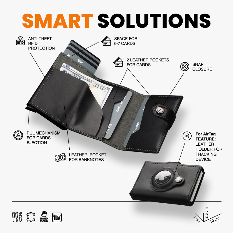 Dwie łatwo dostępne kieszonki idealnie zorganizują dokumenty, karty lub wizytówki. Dodatkowym atutem jest skórzana kieszeń na banknoty. Dzięki technologii RFID zastosowanej w designie portfela, Twoje wrażliwe dane oraz środki na kartach płatniczych są całkowicie bezpieczne i chronione przed nieautoryzowanym sczytaniem lub kradzieżą. Zaprojektowany uchwyt na airtag pozwala na wygodne przechowywanie dodatkowego zabezpieczenia Twojego portfela. Specjalny mechanizm stopniowego wysuwania kart pozwala szybko sięgnąć po tę, której szukamy. Wzór zarejestrowany - unikalny i oryginalny!