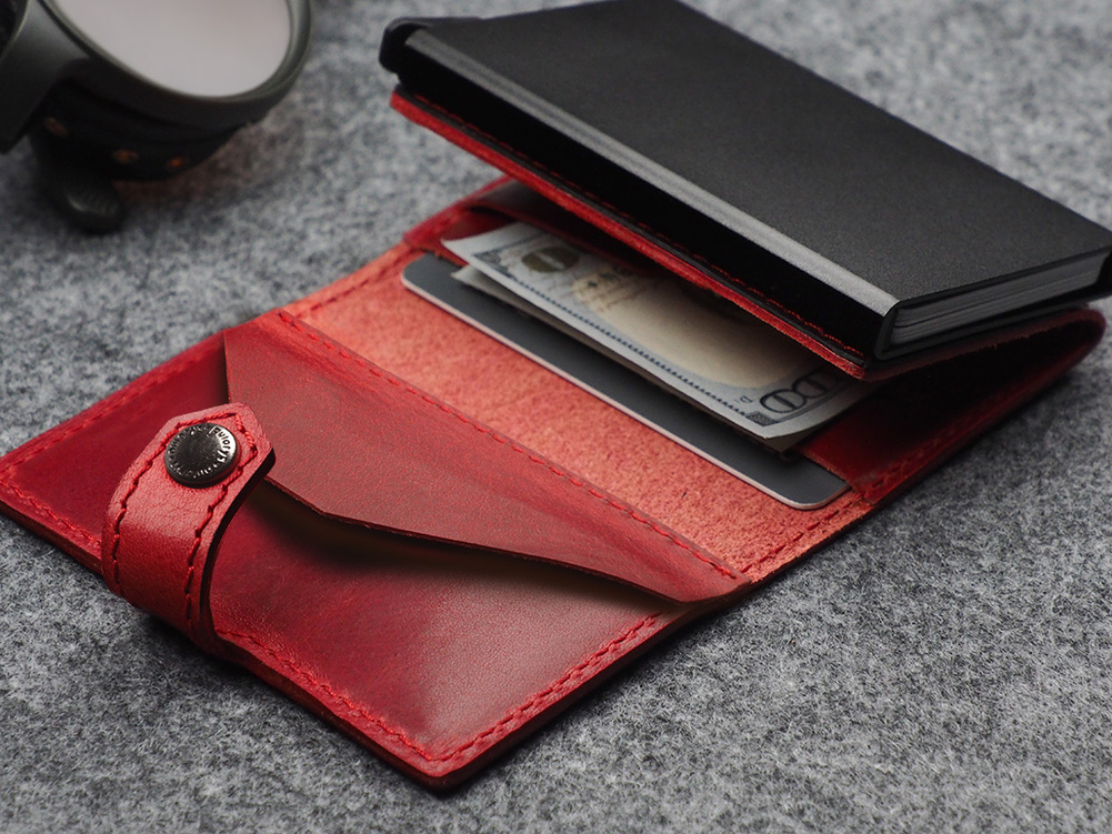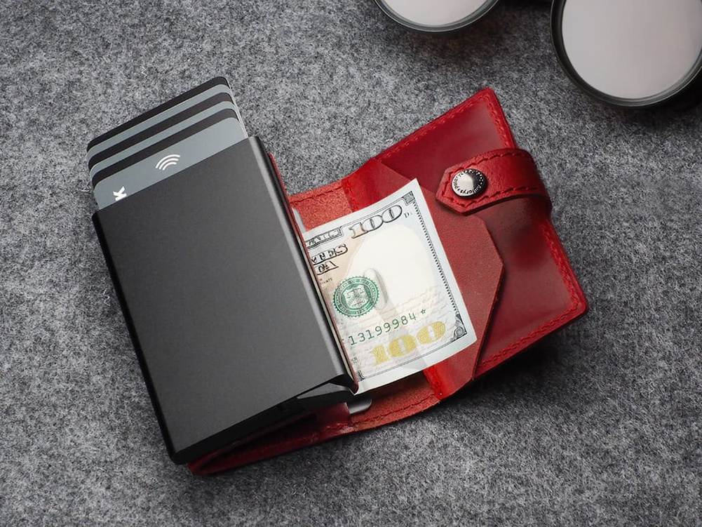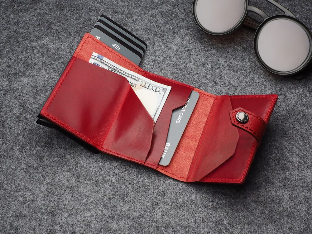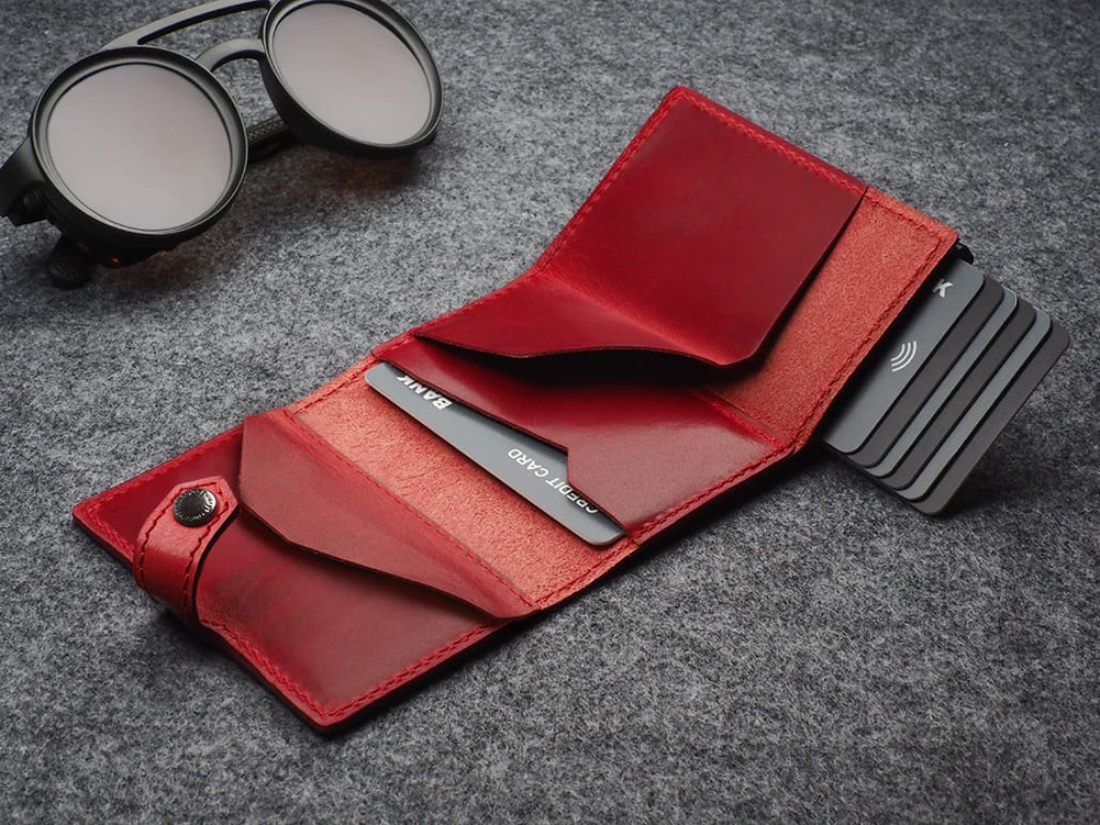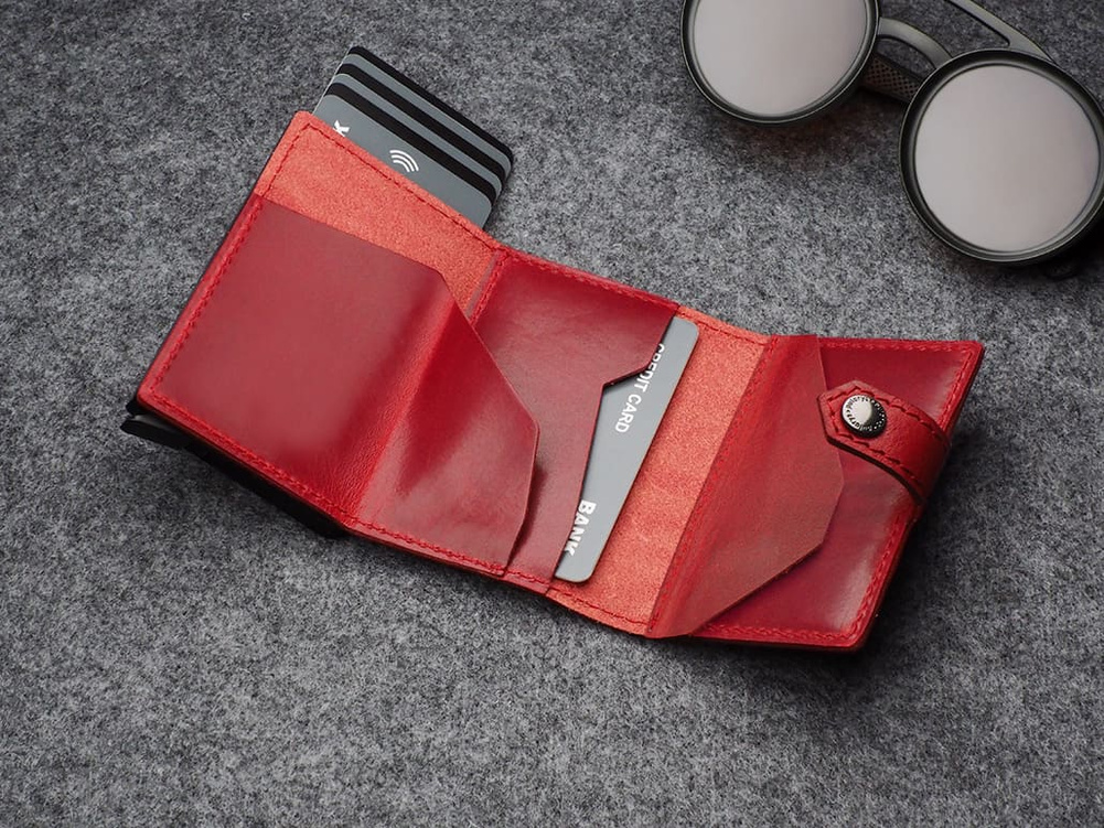 Wewnątrz kieszonka na dokumenty lub wizytówki oraz dodatkowa kieszonka na monety, zamykana klapką. Banknoty przechowasz w unikalnej przegródce wykonanej w całości ze skóry. Dzięki technologii blokowania RFID zastosowanej w designie portfela, Twoje wrażliwe dane oraz środki na kartach płatniczych są całkowicie bezpieczne i chronione przed nieautoryzowanym sczytaniem lub kradzieżą. Specjalny mechanizm stopniowego wysuwania kart pozwala szybko sięgnąć po tę, której szukamy.