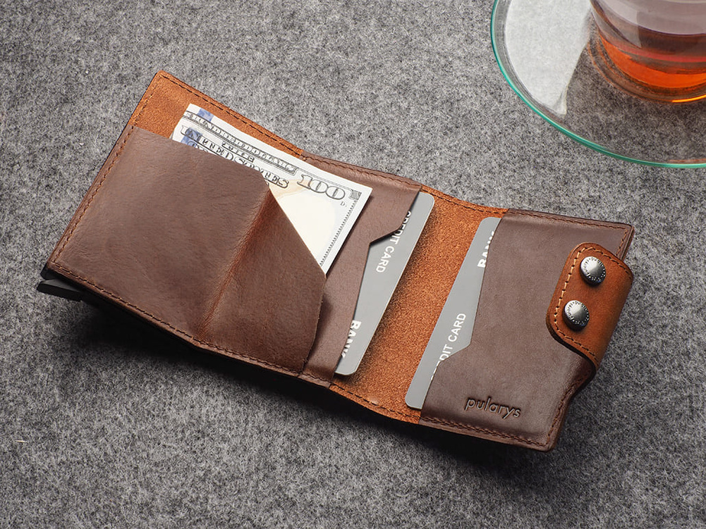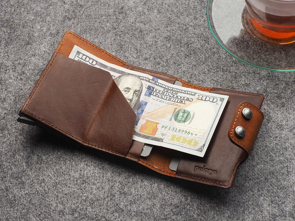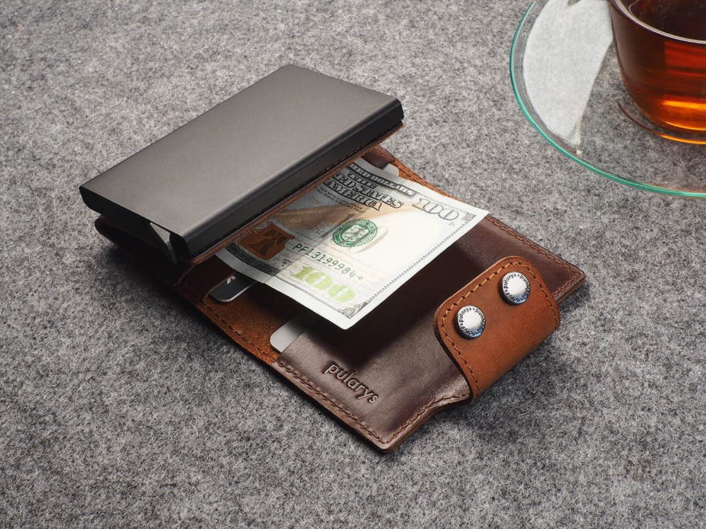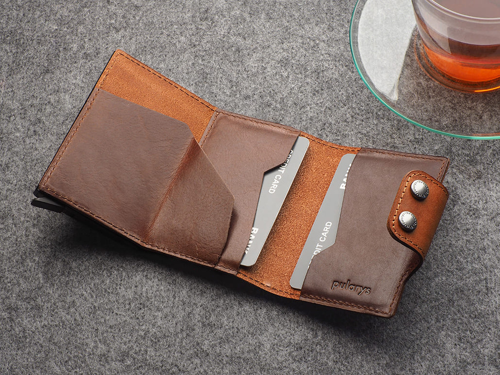 Wykonany z roślinnie garbowanej skóry Nomad. Przechowa wiele kart i dokumentów, zapewniając do nich łatwy dostęp, dzięki specjalnemu mechanizmowi stopniowego wysuwania kart. Kieszonka na banknoty dodatkowo zwiększa jego funkcjonalność. Dzięki technologii blokowania RFID zastosowanej w designie portfela, Twoje wrażliwe dane oraz środki na kartach płatniczych są całkowicie bezpieczne i chronione przed nieautoryzowanym sczytaniem lub kradzieżą. Klapka zapinana jest na dwa eleganckie zatrzaski. Unikalny na rynku wzór zarejestrowany.