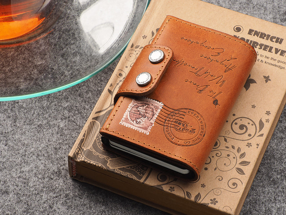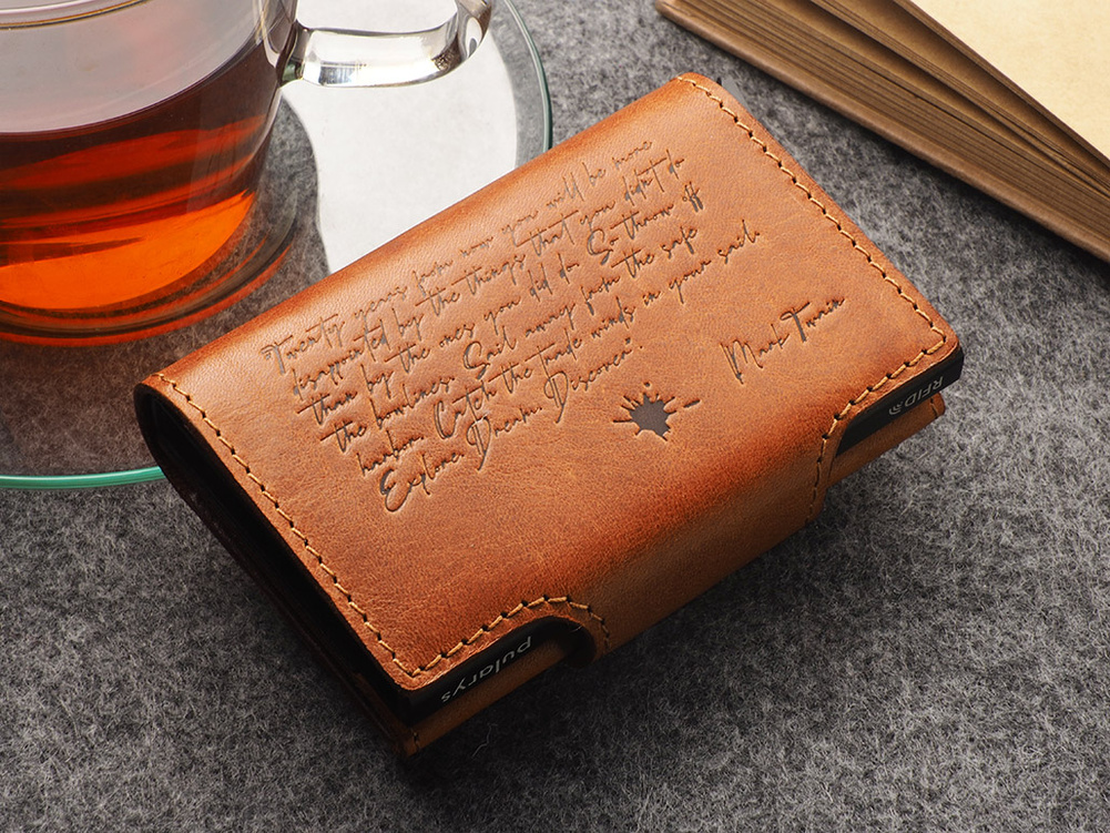 Portfel zdobiony motywami pocztowymi w stylu vintage oraz wytłoczonym cytatem znakomitego amerykańskiego pisarza - Marka Twaina.