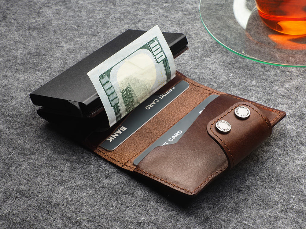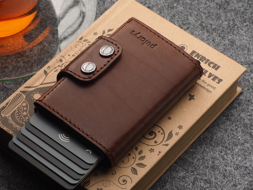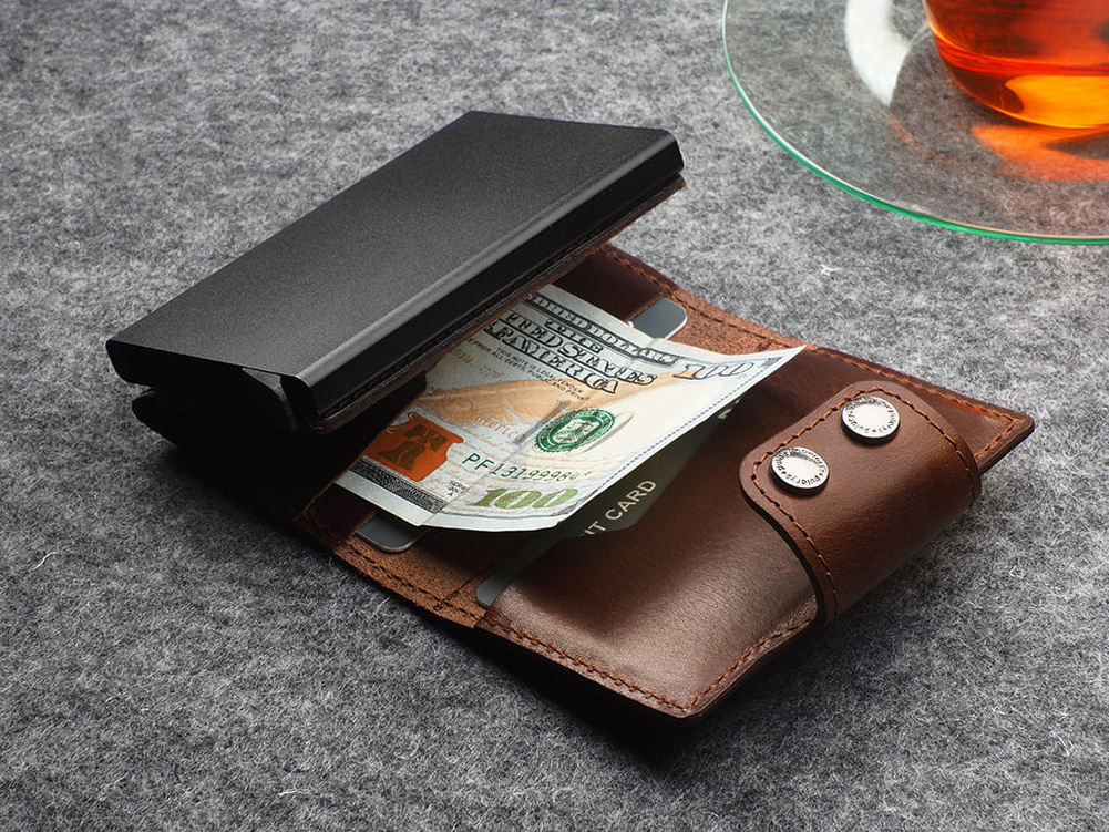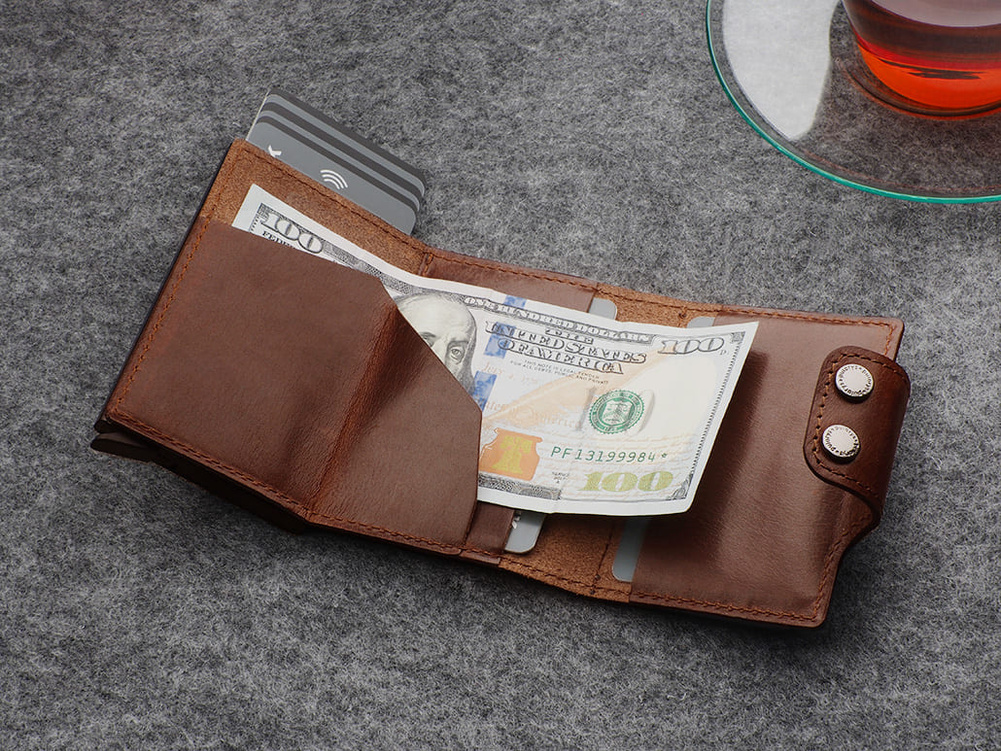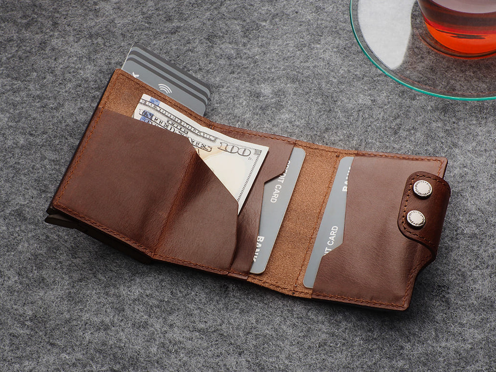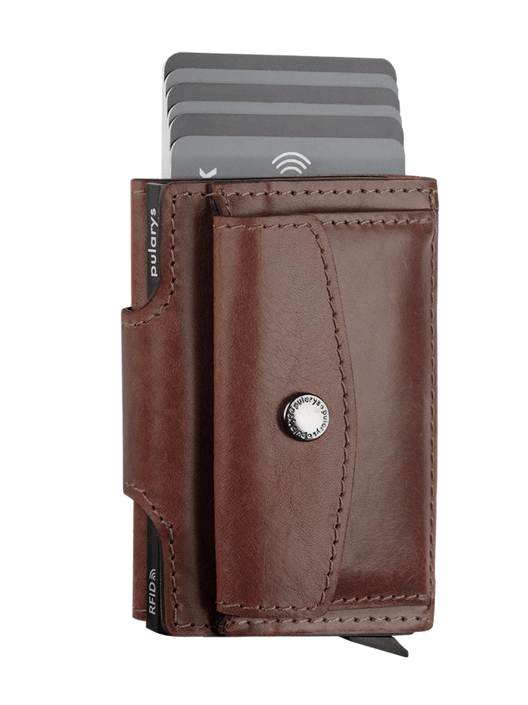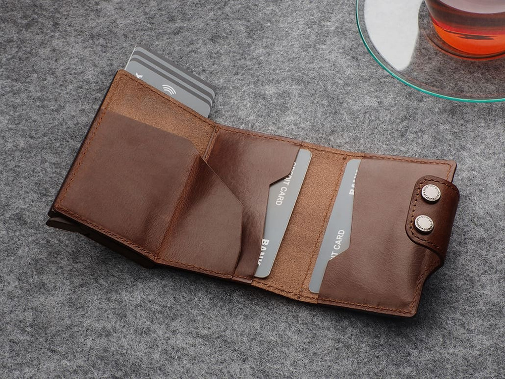 Wykonany z roślinnie garbowanej skóry Nomad. Pojemny - przechowa wiele kart i dokumentów, zapewniając do nich łatwy dostęp, dzięki specjalnemu mechanizmowi stopniowego wysuwania kart. Dodatkowym atutem jest unikalna przegródka na banknoty, wykonana w całości ze skóry. Wewnątrz portfel przechowa wiele kart i banknoty oraz niezbędny bilon - w eleganckiej, zewnętrznej kieszonce. Klapka zapinana jest na dwa eleganckie zatrzaski. Dzięki technologii blokowania RFID zastosowanej w designie portfela, Twoje wrażliwe dane oraz środki na kartach płatniczych są całkowicie bezpieczne i chronione przed nieautoryzowanym sczytaniem lub kradzieżą.