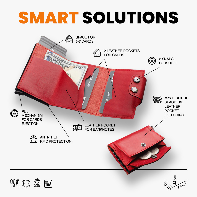 Wykonany z roślinnie garbowanej skóry Nomad. Pojemny - przechowa wiele kart i dokumentów, zapewniając do nich łatwy dostęp, dzięki specjalnemu mechanizmowi stopniowego wysuwania kart. Dodatkowym atutem jest unikalna przegródka na banknoty, wykonana w całości ze skóry. Wewnątrz portfel przechowa wiele kart i banknoty oraz niezbędny bilon - w eleganckiej, zewnętrznej kieszonce. Klapka zapinana jest na dwa eleganckie zatrzaski. Dzięki technologii blokowania RFID zastosowanej w designie portfela, Twoje wrażliwe dane oraz środki na kartach płatniczych są całkowicie bezpieczne i chronione przed nieautoryzowanym sczytaniem lub kradzieżą.