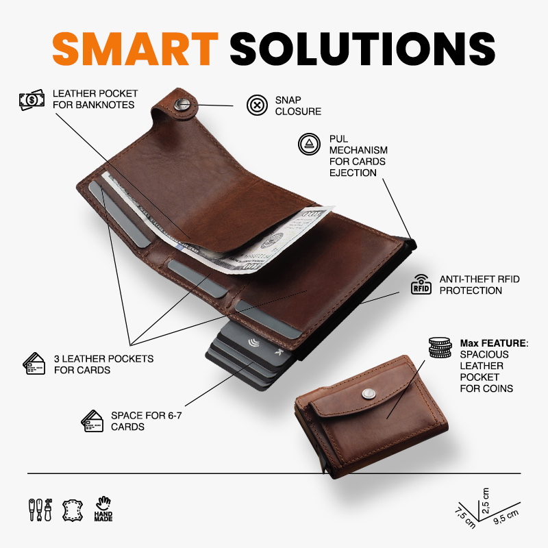 Rozmiar: 7,5 x 9,5 x 3 cm Materiał: Skóra Nomad Kieszeń na banknoty Kieszeń na bilon Mieści 9 kart Wzór zarejestrowany ® Zabezpieczenie RFID Zasobny, a skromny.