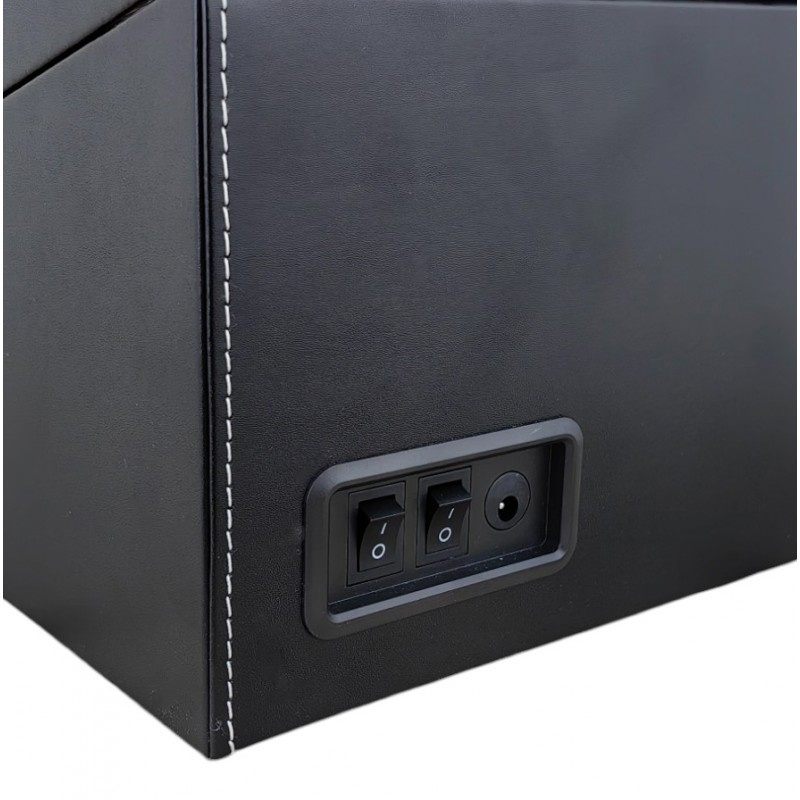 wyścielone miękką ekoskórą - szybka prezentująca zegarki - Zasilacz w zestawie Wymiary: Szerokość - 31 cm Głębokość - 23,8 cm Wysokość - 12,5 - 18 cm Wymiary