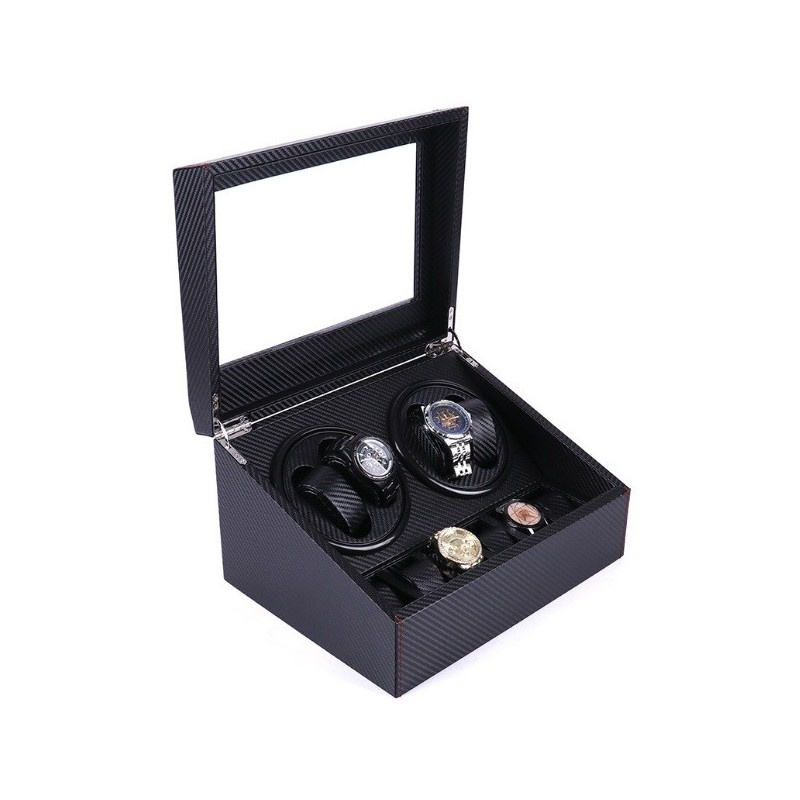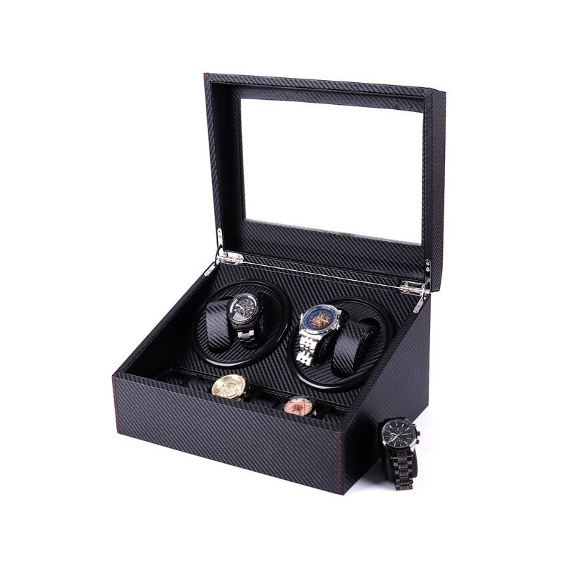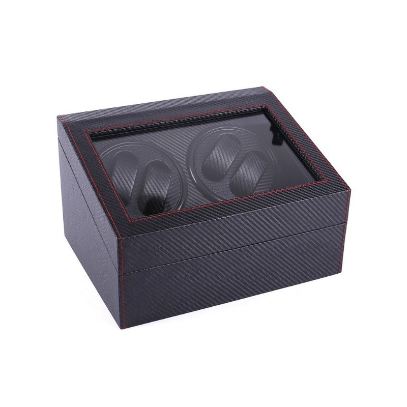 elektryczny - wnętrze wyścielone miękką ekoskórą - szybka prezentująca zegarek - eleganckie pokrycie ze skóry ekologicznej imitującej karbon - Zasilacz w zestawie