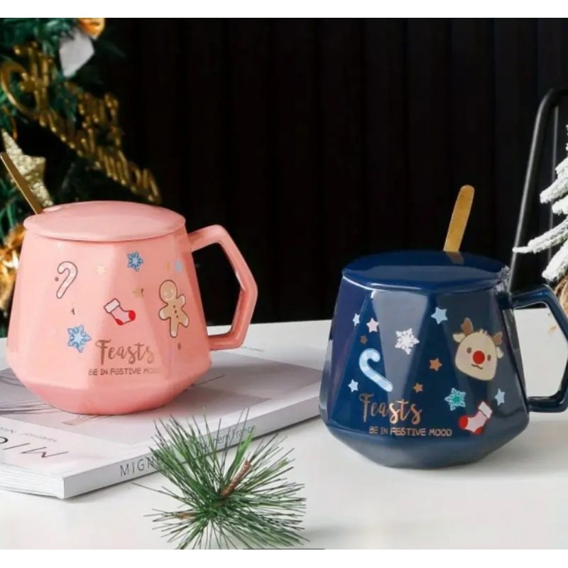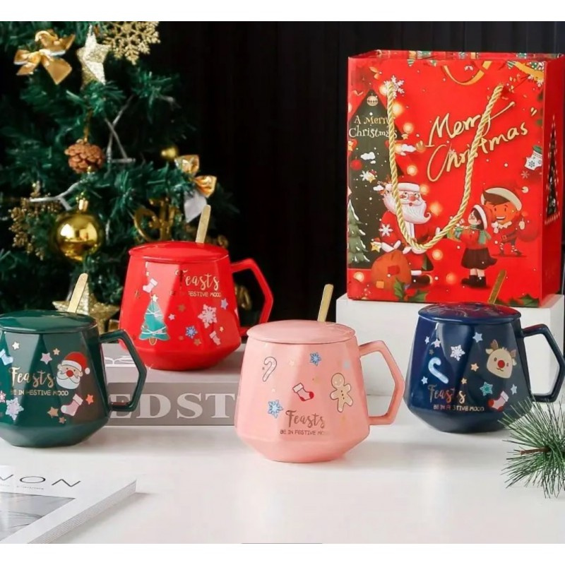 KUBEK CERAMICZNY CZERWONY z motywem świątecznym zestaw z pokrywką i łyżeczką Idealny gadżet dla każdego miłośnika kawy czy herbaty.