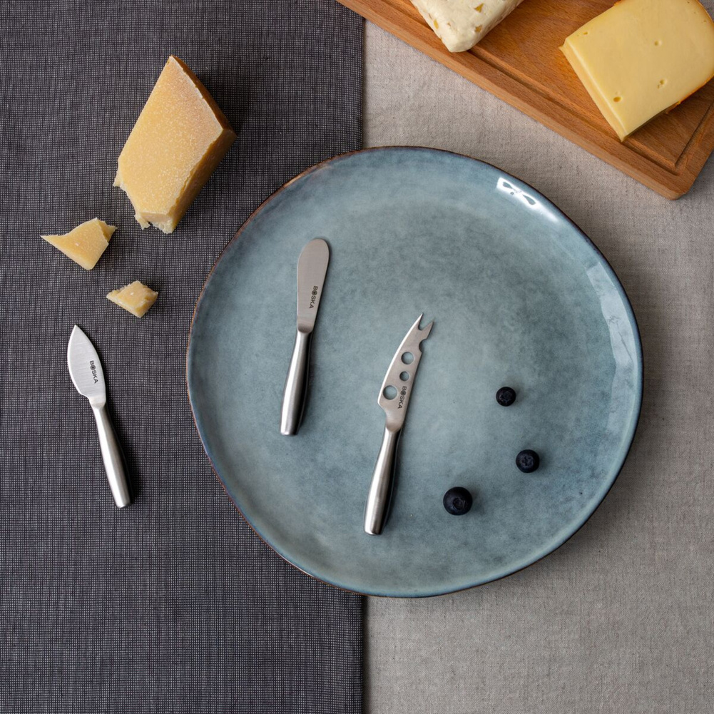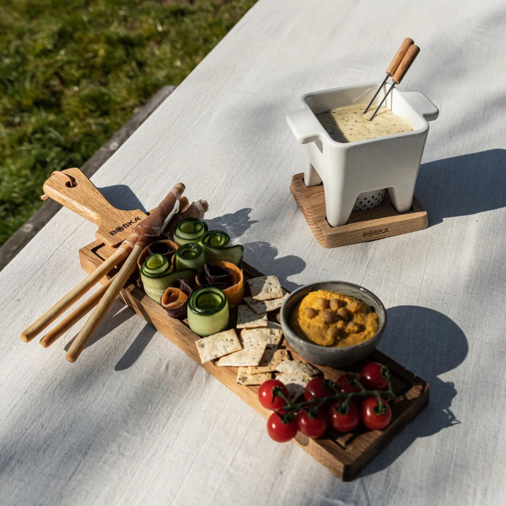 Elegancka dębowa deska do serwowania przekąsek 53 cm + zestaw 3 mini noży do sera! Deska ma wprost wymarzony kształt do serwowania przekąsek z sera, które prezentują się na niej po królewsku. Idealnie nadaje się na spotkania rodzinne i imprezy. Grubość deski to aż 2,2cm,całkowita długość 53 cm a szerokość 12 cm a powierzchnia do serwowania to 34 cm na 8 cm! Do deski dołączono zestaw 3 mini stalowych noży do sera: do sera twardego, miękkiego i do smarowania czyli wszystko to co niezbędne by smakować ser i cieszyć się życiem! Przed pierwszym użyciem deskę należy solidnie naoliwić, pozwolić by drewno chłonęło olej przez kilka dni. Potem czynność należy powtarzać co jakiś czas. Deskę myjemy ręcznie z dodatkiem łagodnych detergentów, dokładnie wycieramy a następnie ustawiamy deskę pionowo z dostępem powietrza z obu stron, aby mogła doschnąć naturalnie. Przybliżone wymiary deski: - grubość: 2,2cm, - długość: 53cm, - szerokość: 12cm, powierzchnia do serwowania to 34cm na 8cm. Przybliżone wymiary noża cheesy: - całkowita długość: 14,5cm, - długość ostrza: 6,8cm, - szerokość: 2cm. Przybliżone wymiary noża do sera twardego: - długość całkowita: 12,3 cm, - długość ostrza bez rączki: 4,5 cm, - szerokość: 2cm. Przybliżone wymiary noża do smarowania: - całkowita długość: 12,7cm, - długość ostrza: 6cm, - szerokość: 2cm. Przybliżone wymiary brutto: - wysokość: 13cm, - długość: 53cm, - szerokość: 4cm. Przybliżona waga brutto: 0,932kg. Opakowanie: brak, noże w kartonowym pudełku nakładanym na deskę.