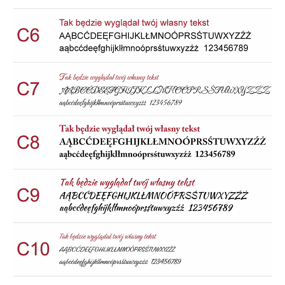 W uwagach do zamówienia należy wpisać tekst do grawerowania oraz numer wybranej czcionki.