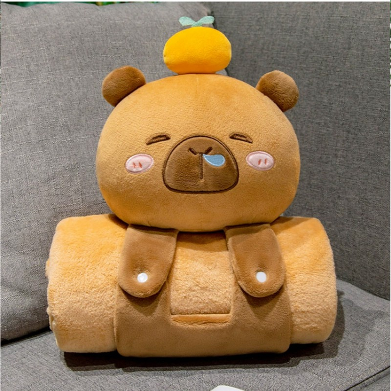 Super miękki KOC Z PODUSZKĄ KAPIBARA XL To uroczy, pluszowy zestaw koc + poduszka w kształcie kapibary.