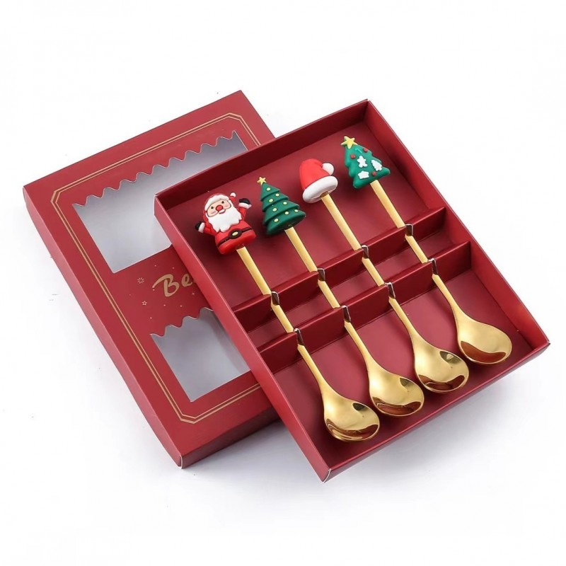 Zestaw łyżeczek ze świątecznymi figurkami w pudełku. Piękny zestaw 4 sztuk łyżeczek w pudełku z przykrywka to idealny pomysł na prezent.