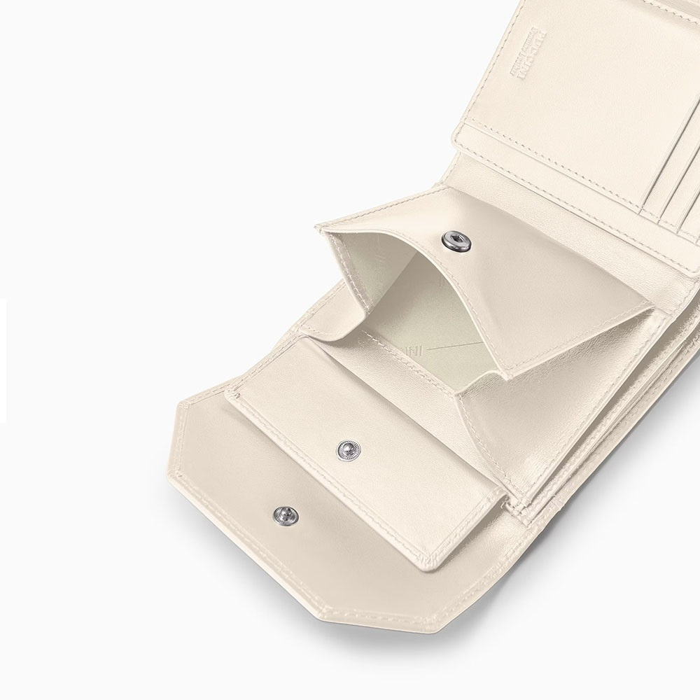 W środku znajduje się osiem miejsc na karty, dwie przegrody na banknoty oraz kieszeń na bilon zamykana na zatrzask. Trzy dodatkowe otwarte kieszonki idealnie sprawdzą się na paragony lub wizytówki. Portfel prezentuje się elegancko i jest zapakowany w stylowe pudełko, dzięki czemu doskonale nadaje się na prezent.
