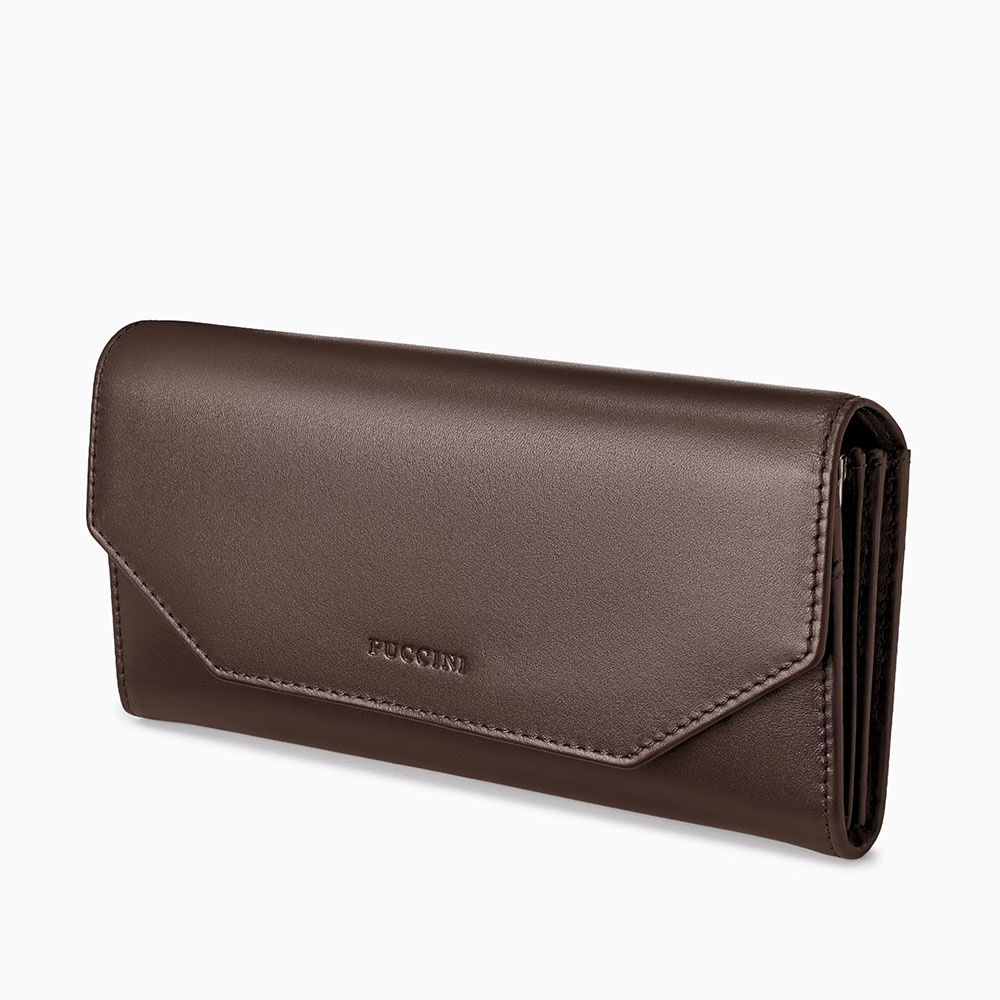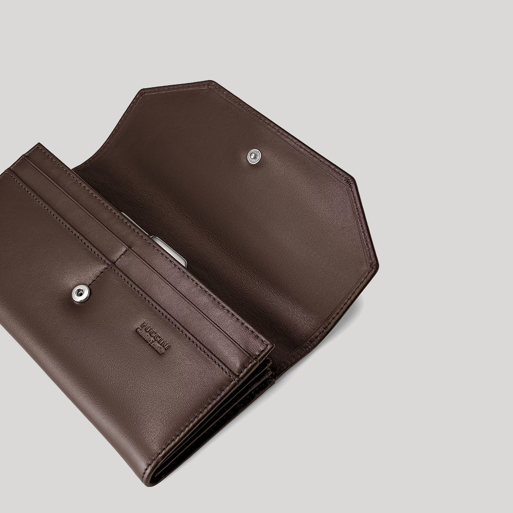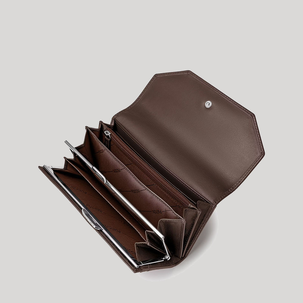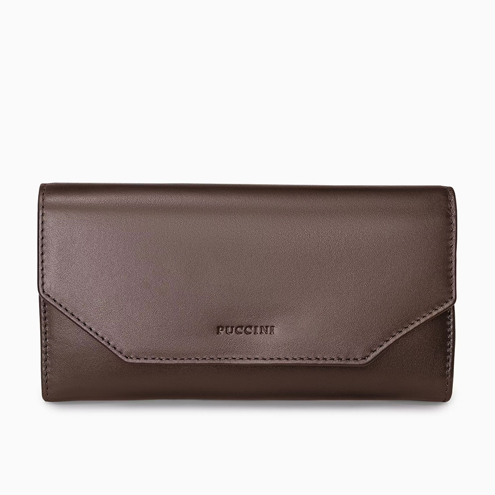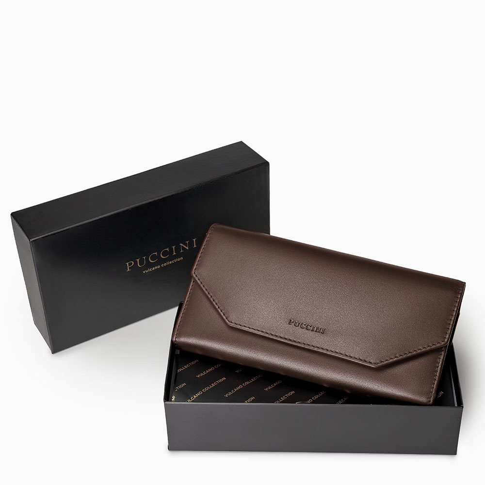 Portfel zamykany jest na solidny zatrzask, a wewnątrz oferuje osiem miejsc na karty, liczne przegrody oraz praktyczną kieszeń na bilon zamykaną na bigiel. Subtelne logo PUCCINI i staranne wykończenie dodają mu elegancji, czyniąc z niego idealny dodatek do każdej damskiej torebki. Zapakowany w gustowne pudełko świetnie sprawdzi się również jako prezent.