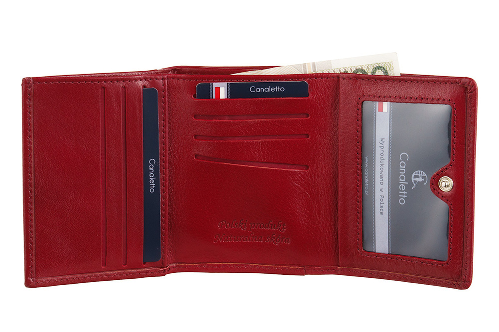 Ponadczasowy styl, wyrafinowane detale i codzienna funkcjonalność – portfel damski Canaletto to połączenie czerwonej naturalnej skóry licowej garbowanej roślinnie z dbałością o każdy detal.