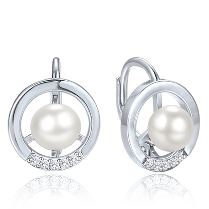Eleganckie srebrne kolczyki MINET ze srebra Ag 925/1000 z kółkiem, perłą i cyrkoniami mają rodowaną powierzchnię i zapięcie patentowe.