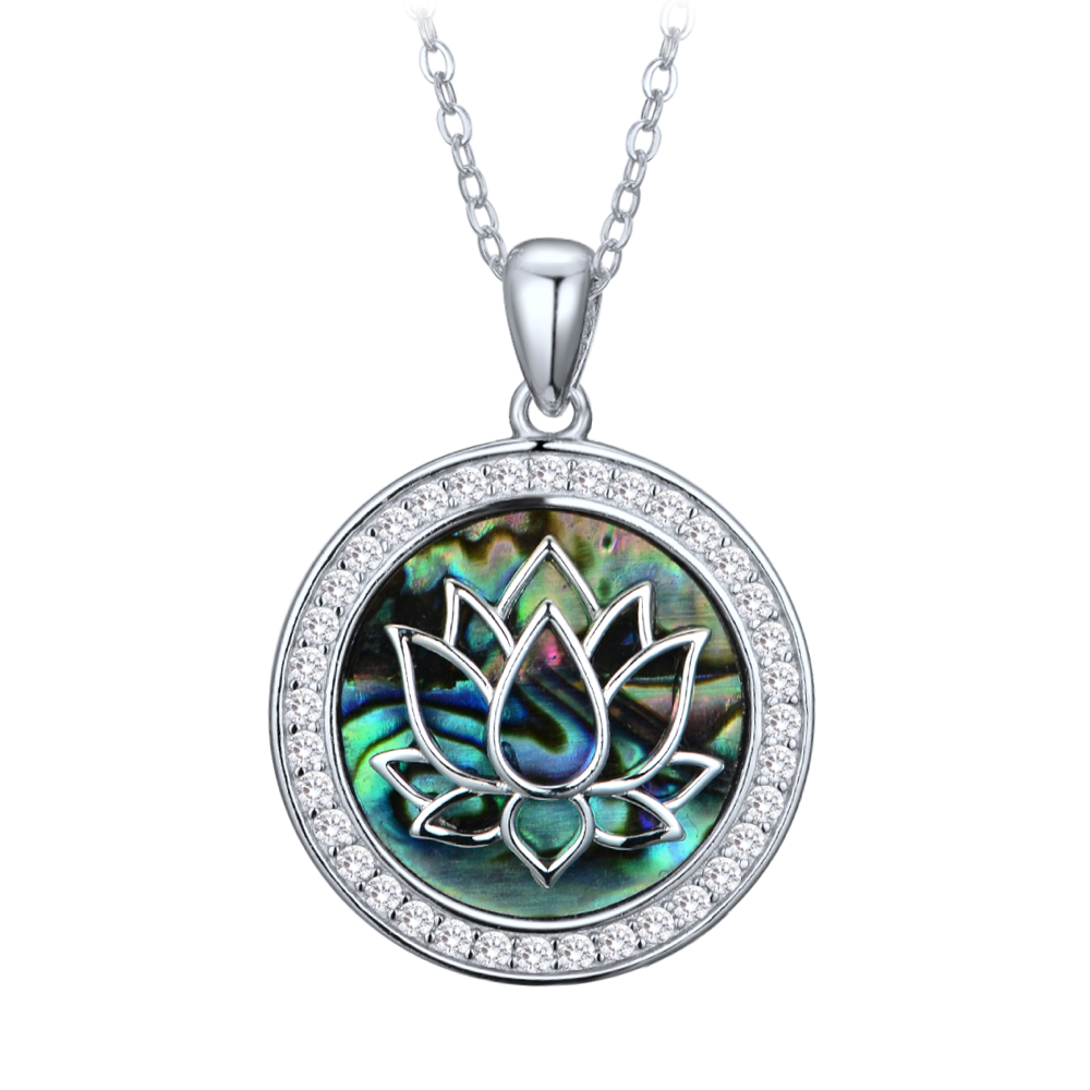 Zawieszka ma motyw kwiatu lotosu, zdobiona jest niebieską masą perłową i białymi cyrkoniami.