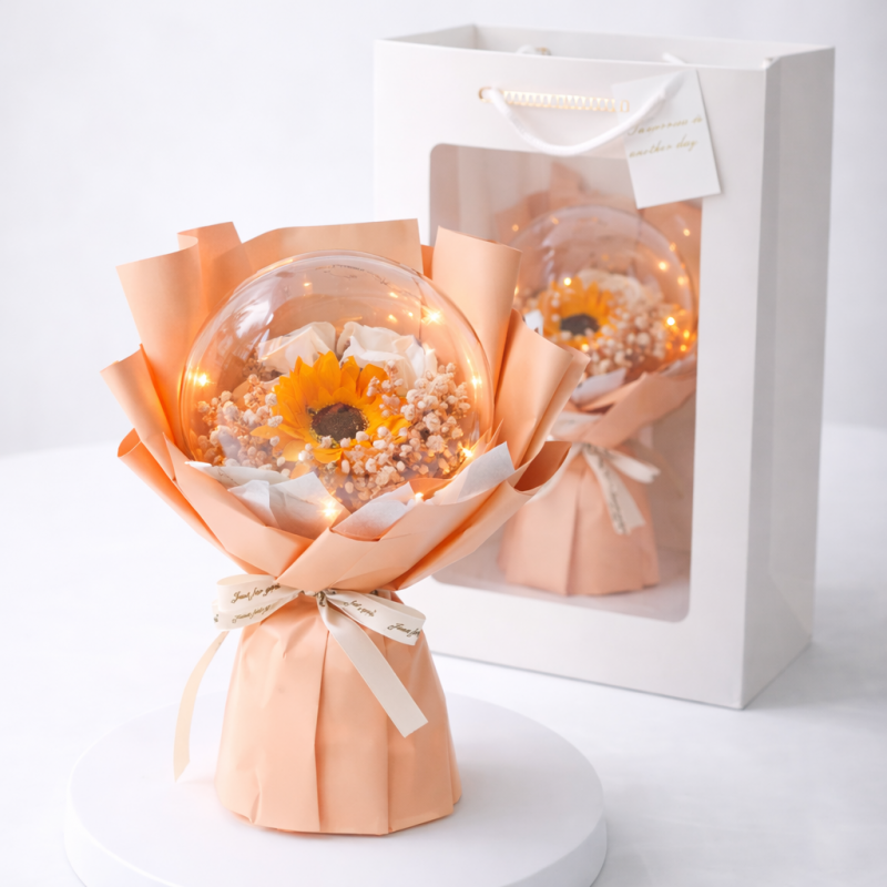 Bukiet zapachowych kwiatów mydlanych w torebce na prezent, kula, świecące LED - BUK14ZO