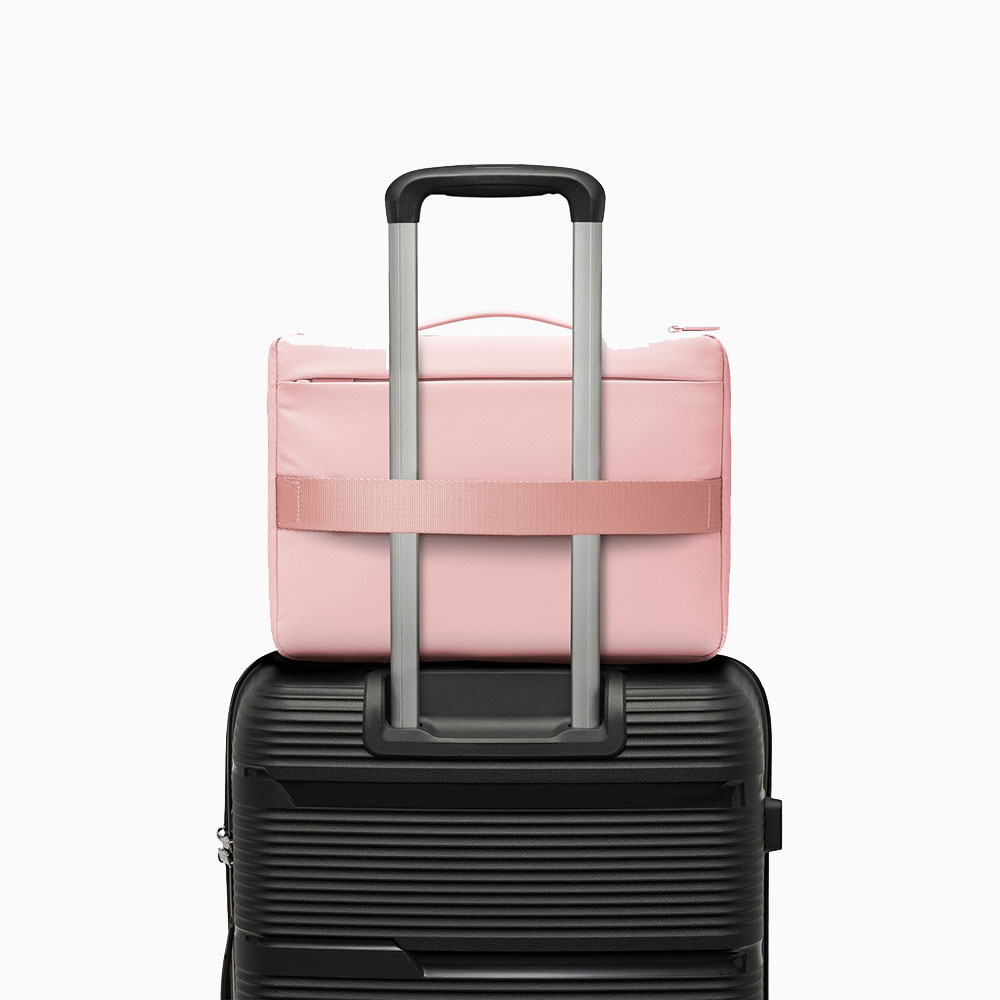 Etui wyposażono w wygodny uchwyt do noszenia w dłoni oraz praktyczny pas umożliwiający zamocowanie go na stelażu walizki, co znacząco ułatwia transport w podróży.