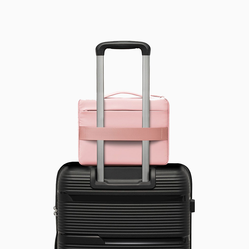 Etui wyposażono w praktyczny uchwyt do noszenia w dłoni oraz pas umożliwiający zamocowanie go na stelażu walizki, co znacznie zwiększa komfort podróżowania.