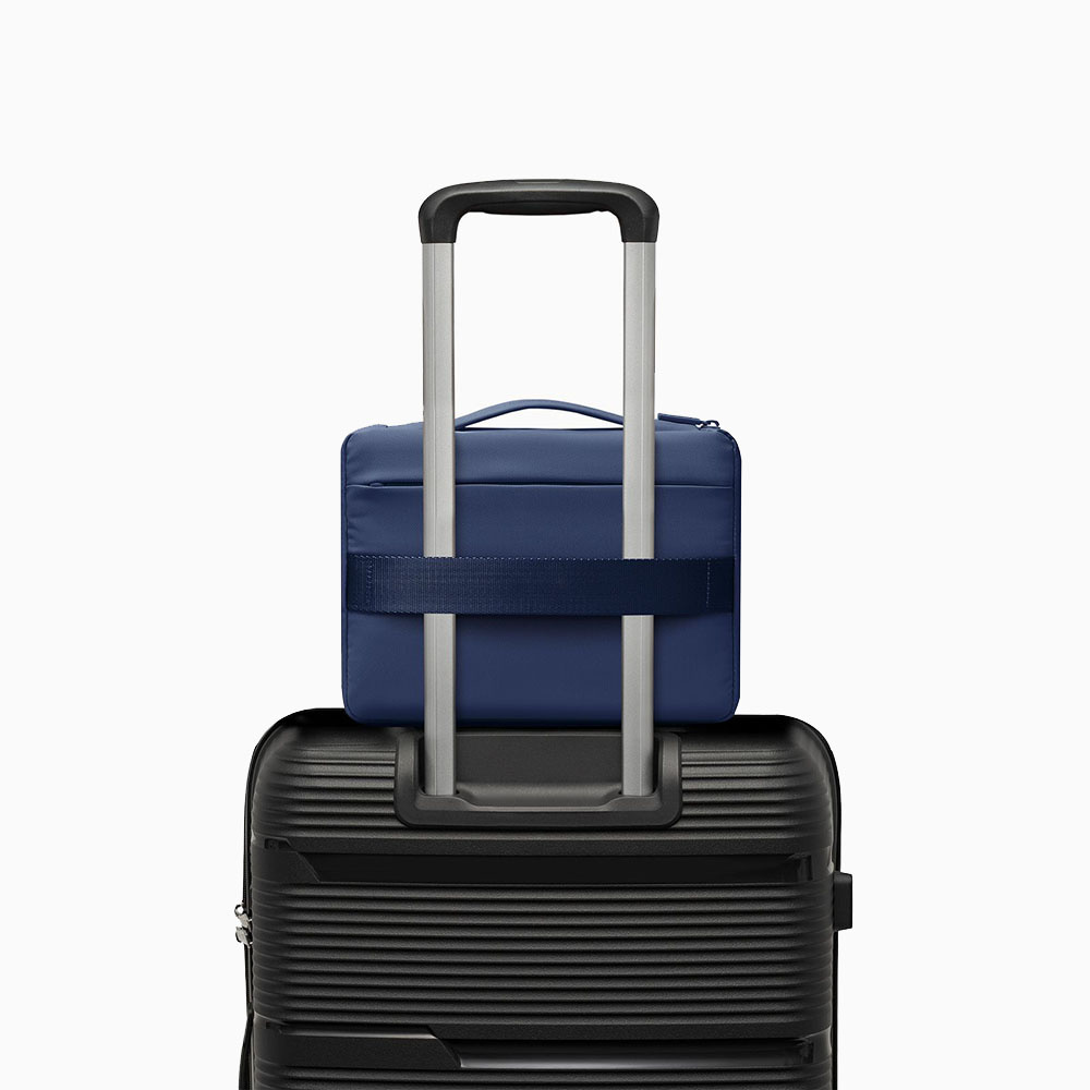 Etui wyposażono w praktyczny uchwyt do noszenia w dłoni oraz pas umożliwiający zamocowanie go na stelażu walizki, co znacznie zwiększa komfort podróżowania.